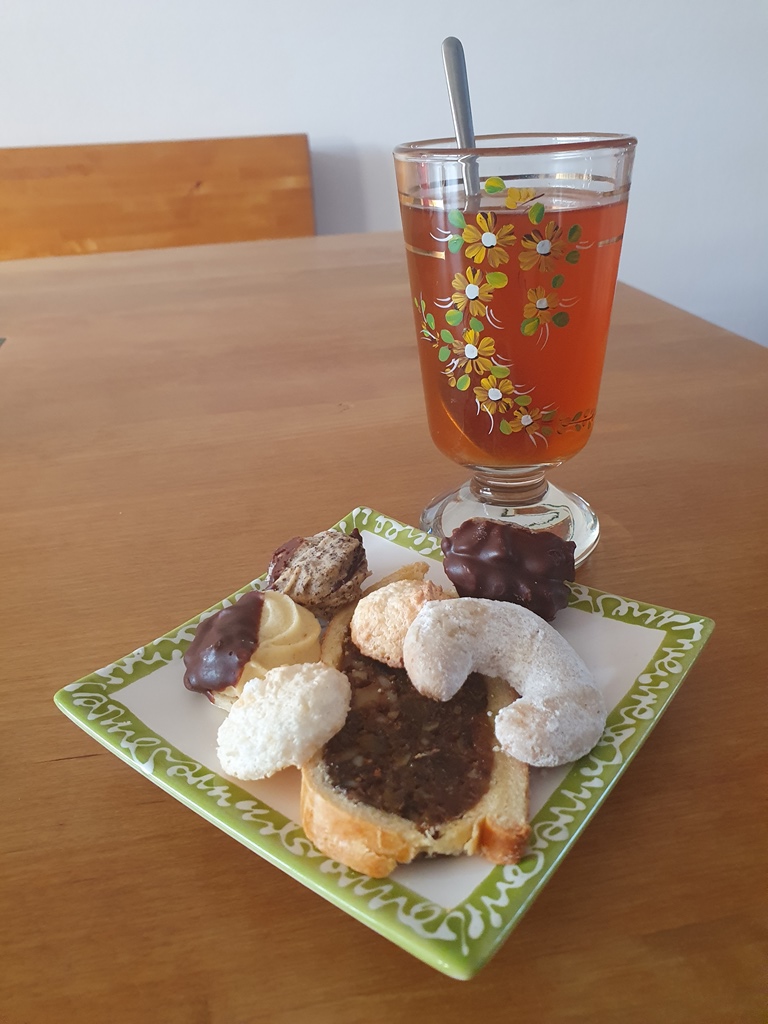 Schnapstee mit Weihnachtskeksen und Kletzenbrot