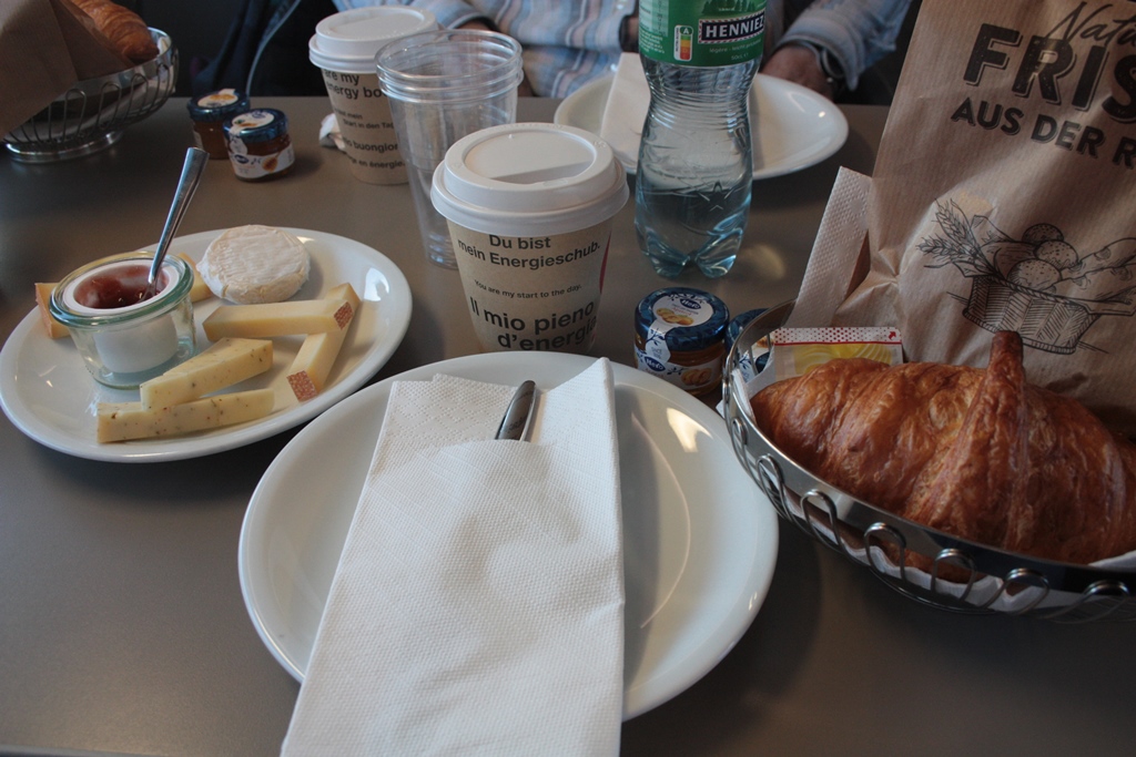 Wir starten wie immer in der Nähe von Zürich und fahren über Bern, Freiburg und Lausanne nach Montreux. Im Zug haben wir Zeit genug und geniessen im Speisewagen ein Zmorge mit Brot, Gipfeli, Konfi, Butter und einem Chäsplättli.