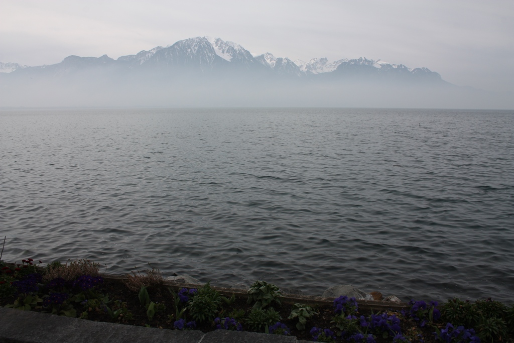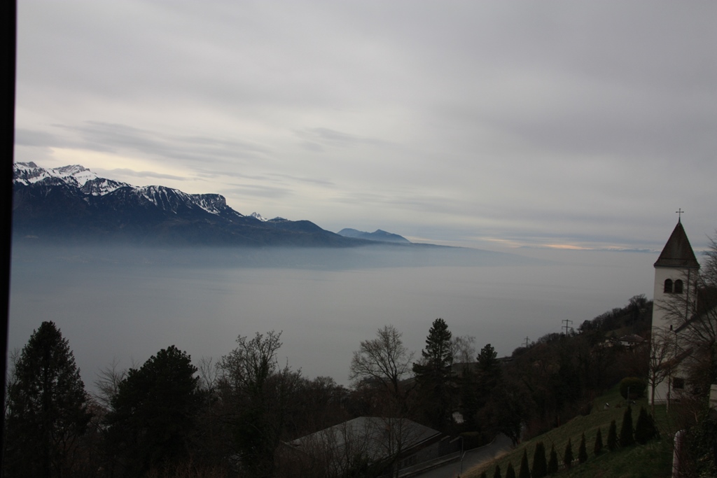 Von Lausanne bis Montreux führt die Strecke am Genfersee entlang, der aber noch fast vollständig im Nebel versunken ist, nur die schneebedeckten Berge der Schweizer und französischen Alpen leuchten in der Sonne.