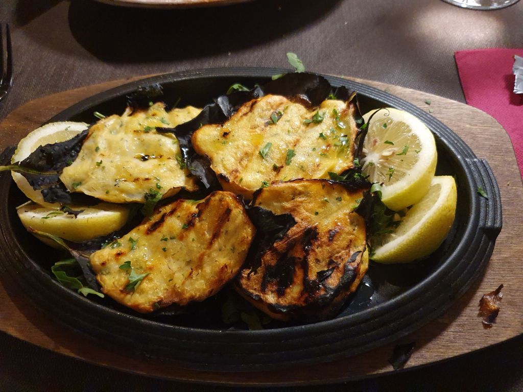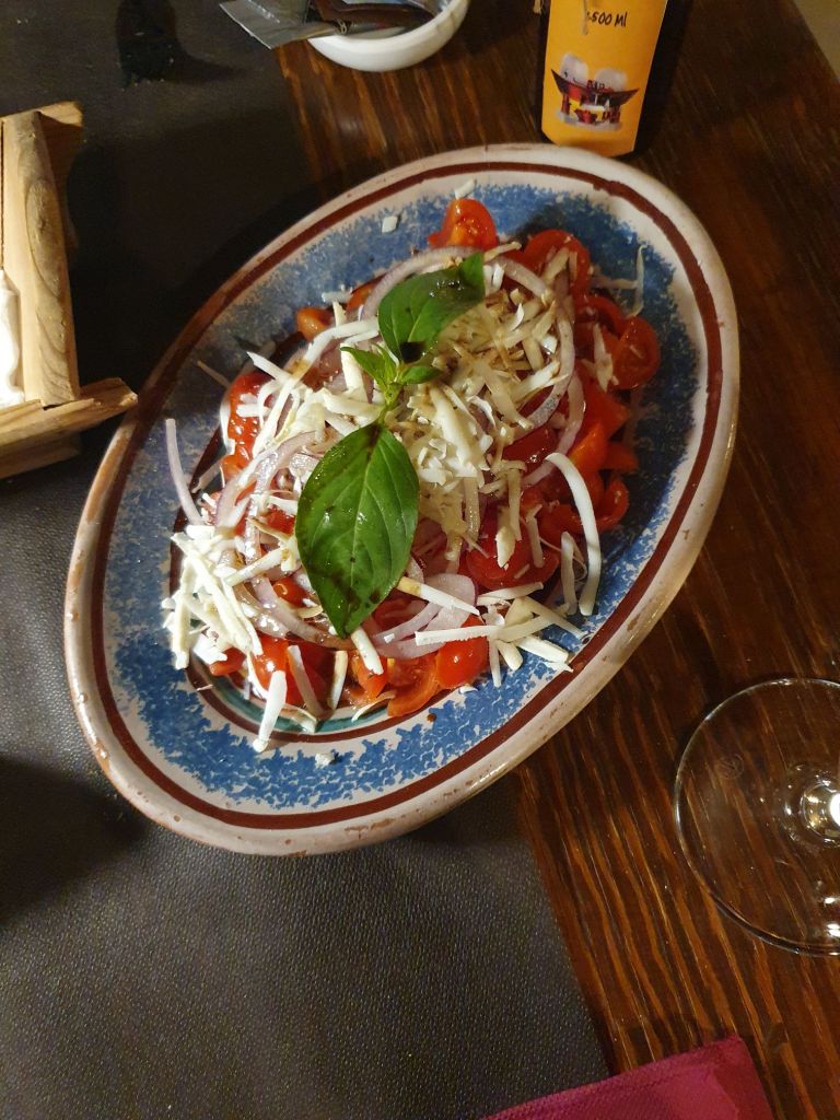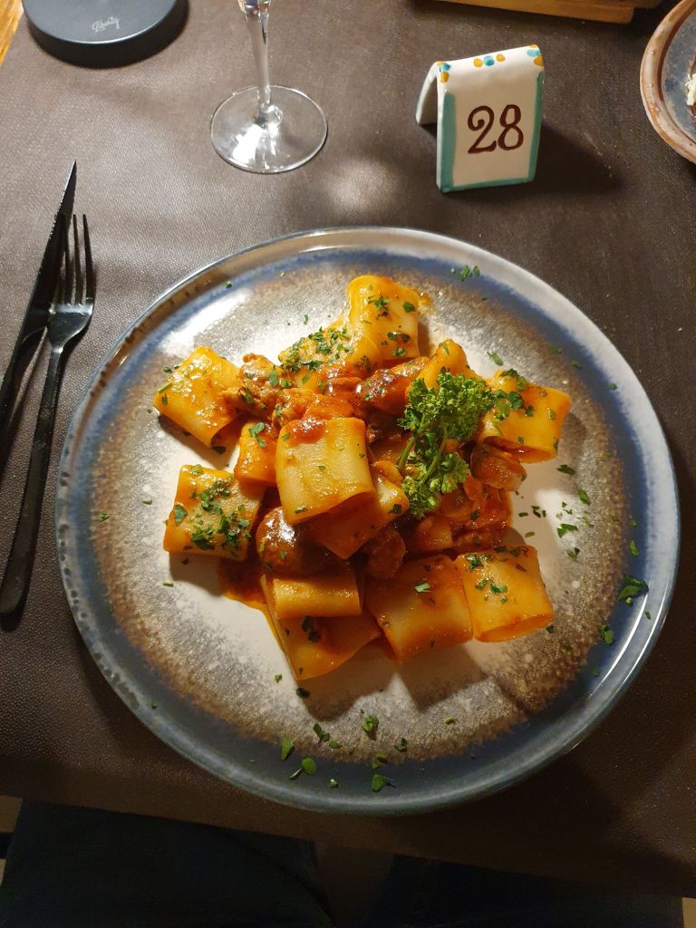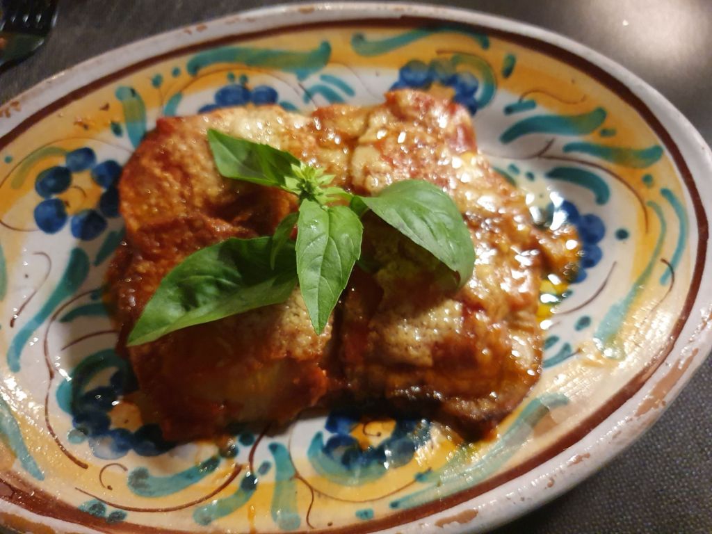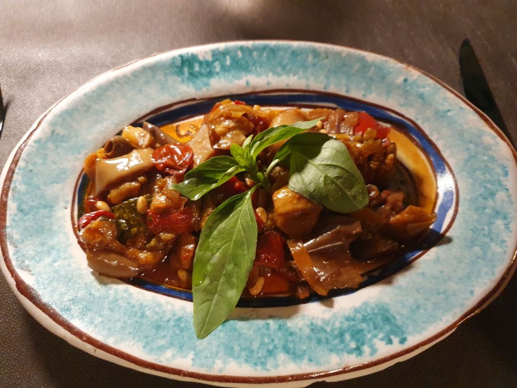 Als Antipasti wählten wir Caponata (Melanzani, karamelisierte Zwiebeln, Oliven, Rosinen, Pfefferoni und Pinienkerne) und Parmiciana (gebackene Melanzani mit Tomatensauce, Mozzarella und Basilikum), die schon ein wahres Geschmackserlebnis waren, dazu als Aperitif Rossini, ein nach dem berühmten Komponisten benannter Cocktail aus Prosecco und Erdbeermus. Zum Hauptgang gab es dann von der Tageskarte Polpette di bianchetto con limone alla griglia,auf Zitronenblättern gegrilltem Fisch und Pacchieri con salsiccia e funghi porcini, einer Pasta mit der italienischen, pikant gewürzten Wurst, Salsiccia und Pilzen in Tomatensauce und dazu Tomatensalat.