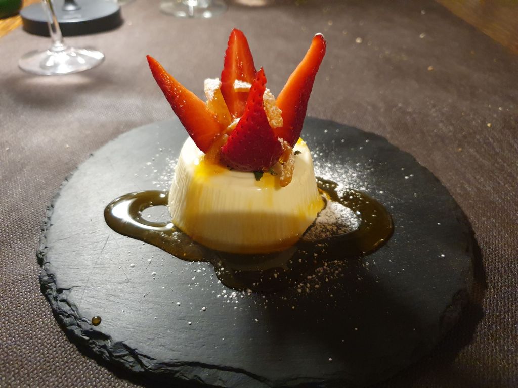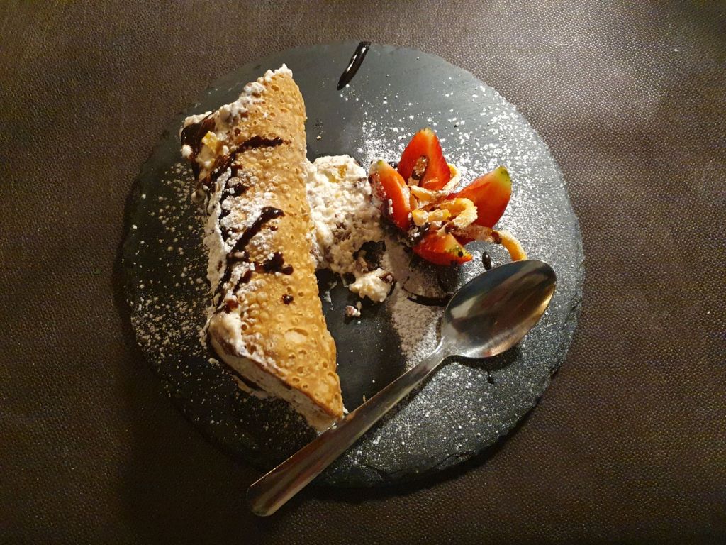 Der angenehme Roséwein und die Nachspeisen, ein erster Canollo und Pannacotta, jeweils mit frischen Erdbeeren, rundeten den Abend ab. Als kleine Überraschung der Küche kamen dann noch zwei Petolli, süße Germteigbällchen und Zimt-Rosolio, ein köstlicher sizilianischer Likör mit verdauungsfördernden Eigenschaften.