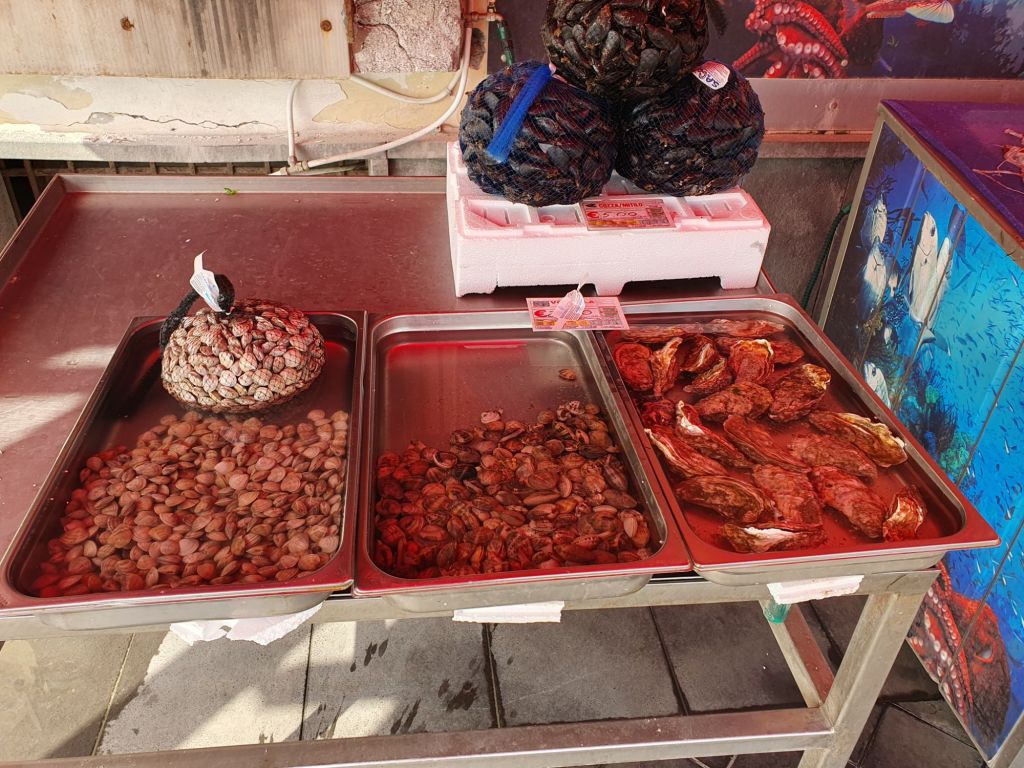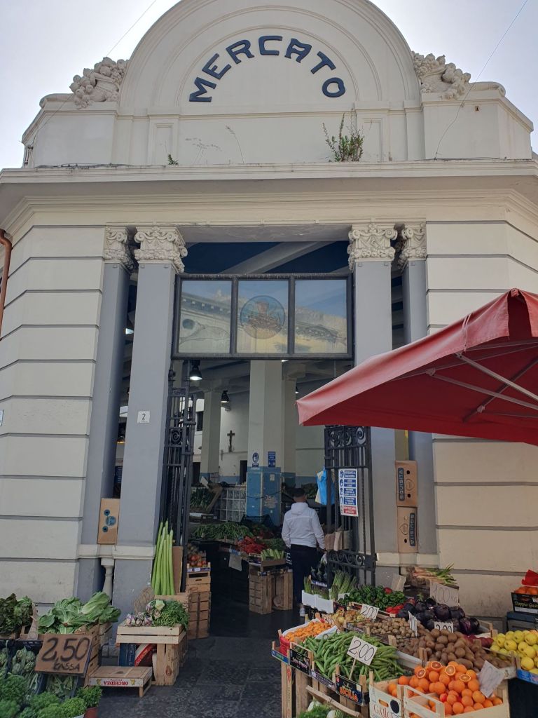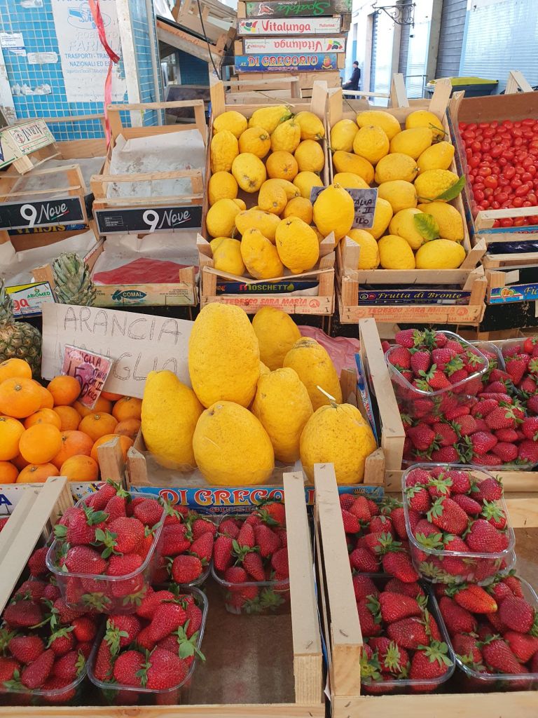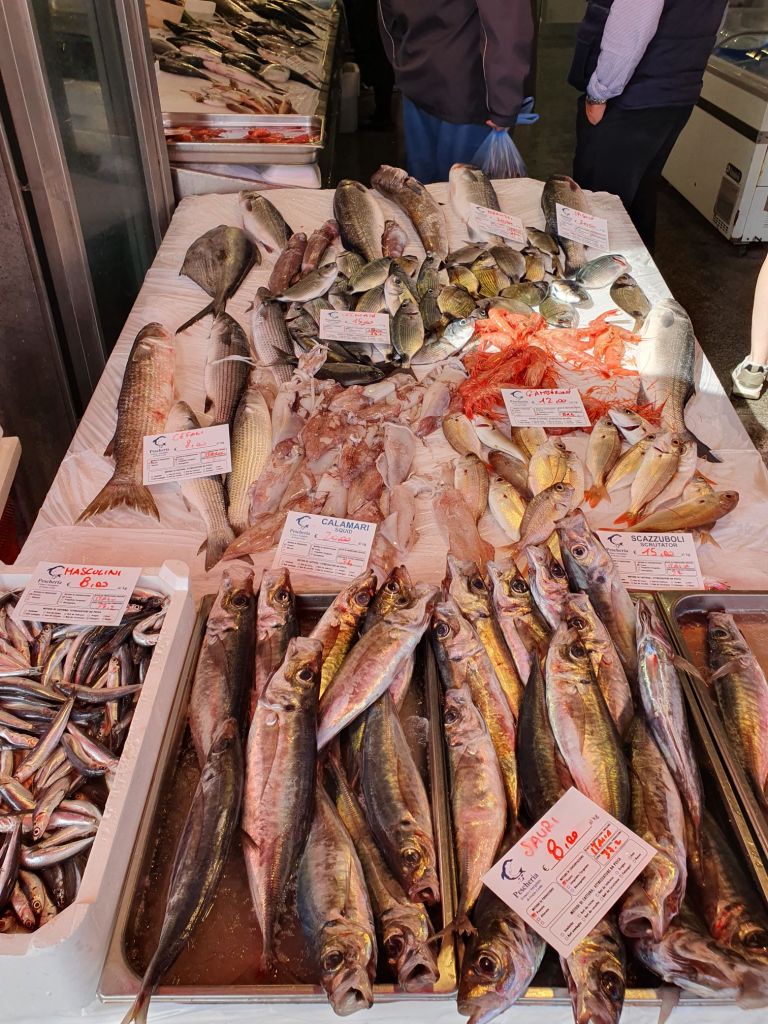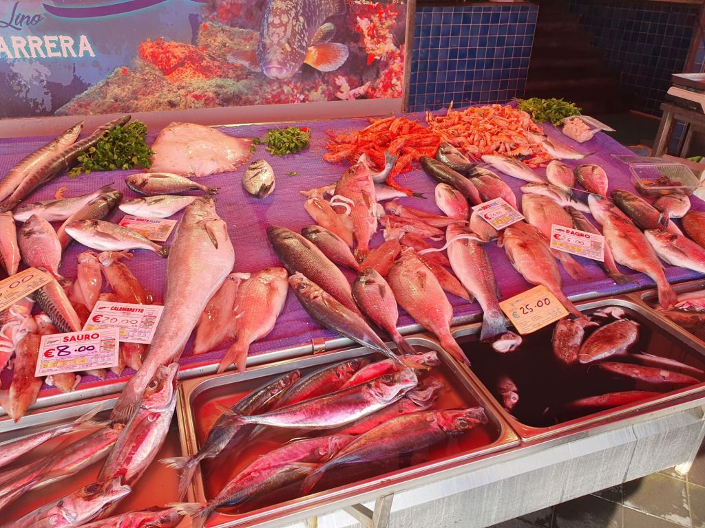 Den ersten Stopp machten wir aber bereits nach wenigen Kilometern in der kleinen Hafenstadt Riposto, um ein erstes Feeling von Meer und Hafen zu bekommen. Waren es noch Kräuter und Blüten, die den Duft im Hotel bestimmten, so war der kleine und geschäftige Mercato geprägt von fangfrischen Fischen und Frutti di Mare als auch von buntem Obst und Gemüse. Hier kaufen primär die Menschen aus der Umgebung, anscheinend aber auch Catanier, denen ihr eigener großer Markt zu überlaufen und hektisch ist.