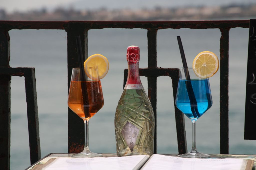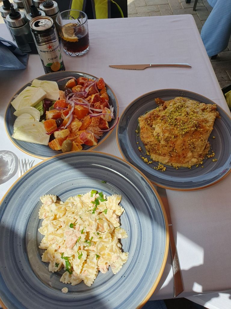 Wir starteten unseren Rundgang über die Hafenpromenade zum Castello Maniace, das aber wegen einer Veranstaltung im Zuge der sizilianischen Filmfestspiele nicht zugänglich ist. Am Weg stoppte uns der Hunger, auch wenn es an einer sehr touristischen Stelle war, mit köstlichem Orangensalat, Farfale mit Lachs, Lasagne mit Pistazien und einem tollen Blick aufs Meer.