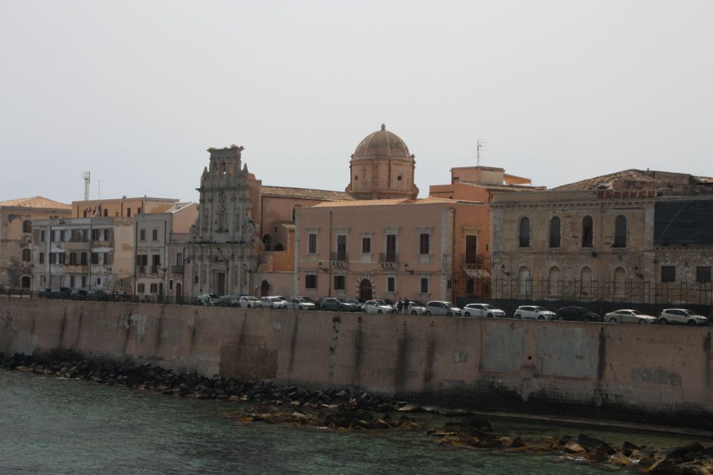 Danach ging es durch das Gassengewirr von Riposto zur Schnellstraße, über die wir auch das überfüllte Catania umfuhren, Richtung Sirakusa. Schon jetzt im Frühjahr wird die Stadt von Touristen gestürmt, was zu einer Anfahrt in die Stadt hinein im Stau mit mehr als einer halben Stunde führte. Auch auf einen freien Platz am bewachten Parkplatz an der Marina mußten wir einige Minuten warten.