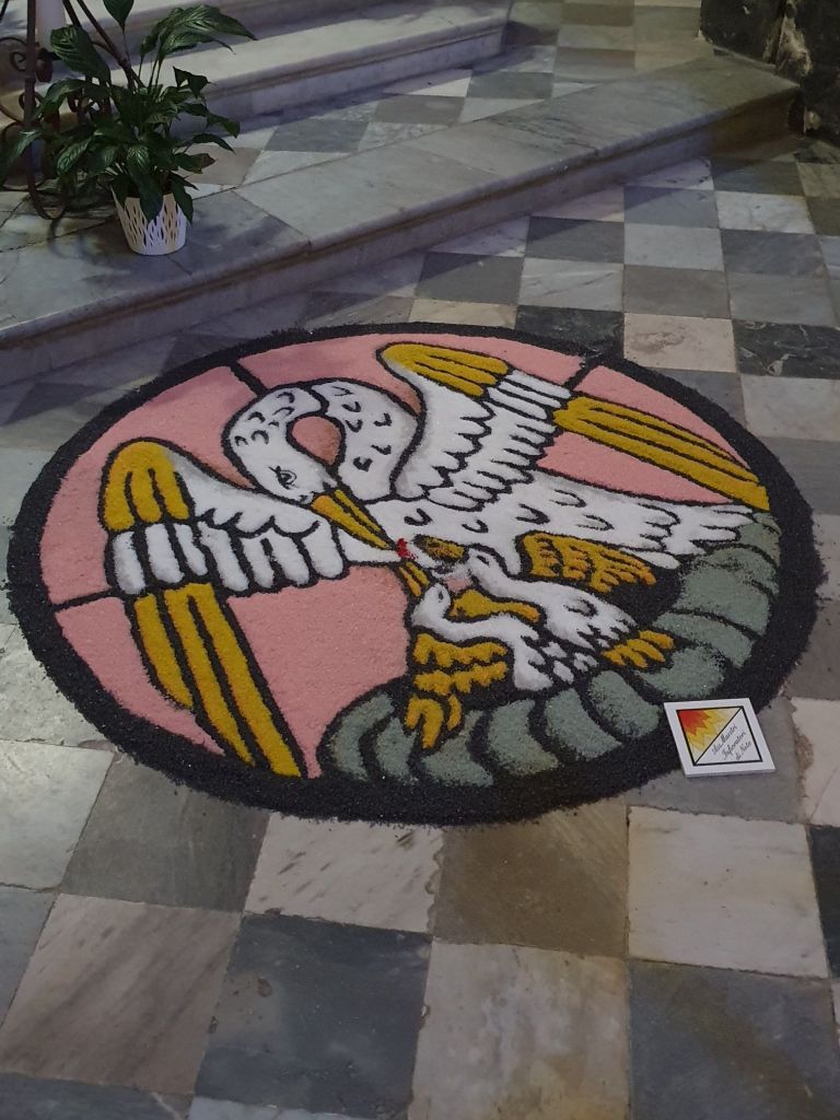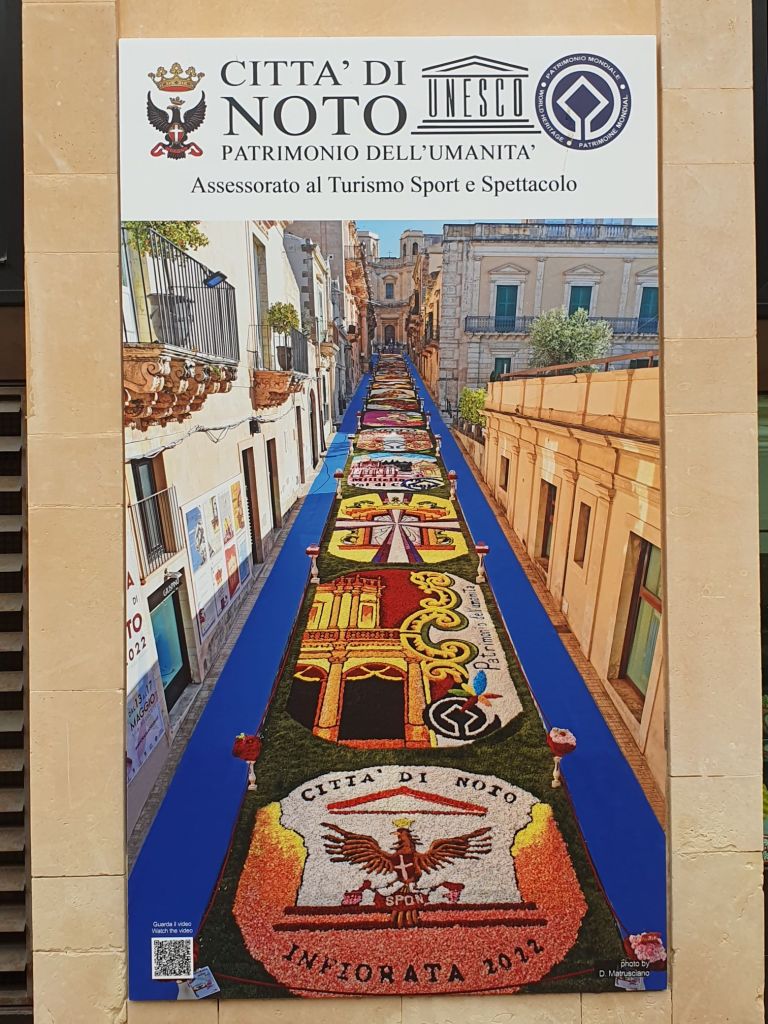 Auch in Noto gibt es ein spezielles Fest, das Infiorata Festival. Dieses ist eine der berühmtesten Veranstaltungen der Stadt und findet jeweils am dritten Wochenende im Mai, um Fronleichnam, statt. Die Tradition der Herstellung von Blumenteppichen geht in Italien auf den Juni des Jahres 1625 zurück, als Benedetto Drei, Chefflorist des Vatikans, die Basilika mit dem Mosaik zum Tag der Heiligen Peter und Paul mit Blumen schmückte. Ich kann leider nur ein Plakat und ein Blumenbild aus dem Dom davon zeigen.