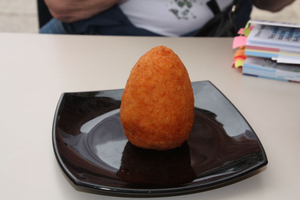 Zur Stärkung gönnten wir uns im Caffe Sicilia am Piazza Duomo unseren ersten Arancino, eine sizilianische Spezialität, ein frittierter Reisball in konischer Form, den man neben einigen anderen Köstlichkeiten unbedingt kosten muß.