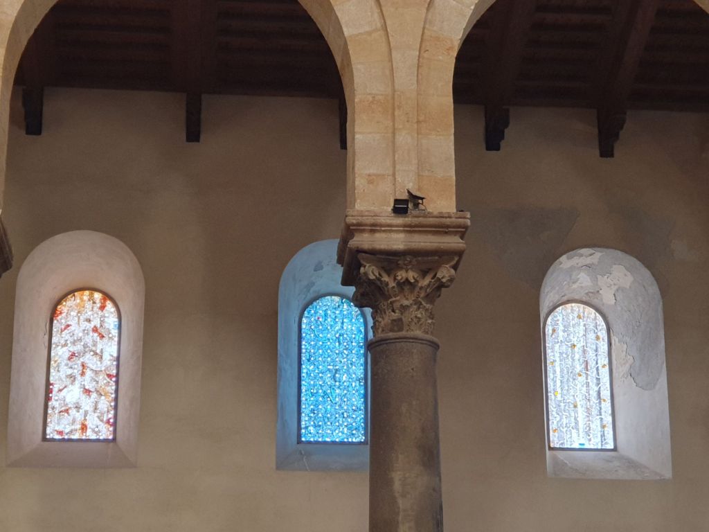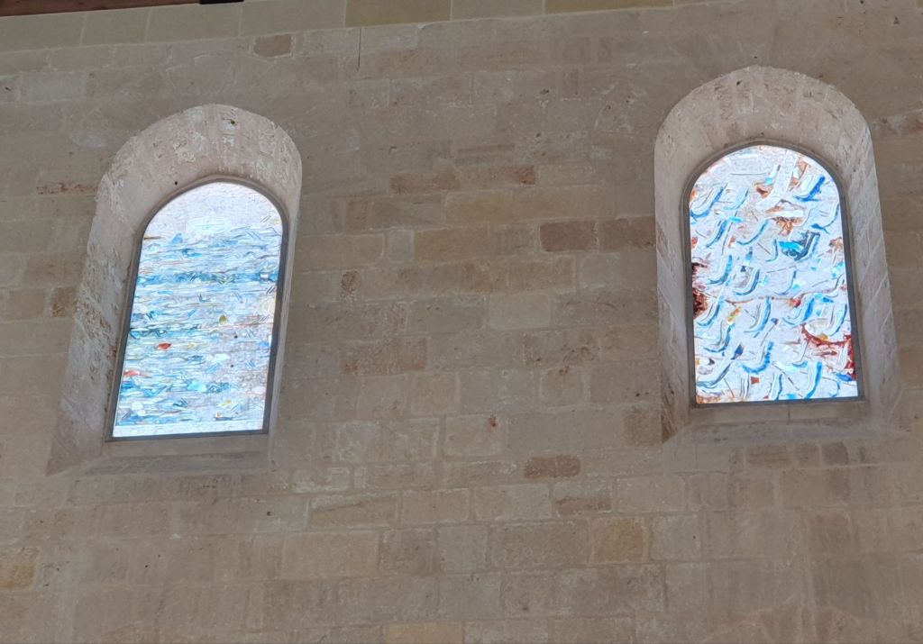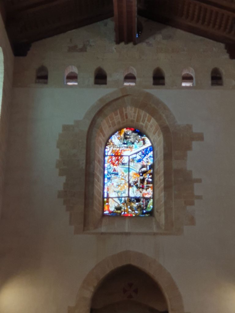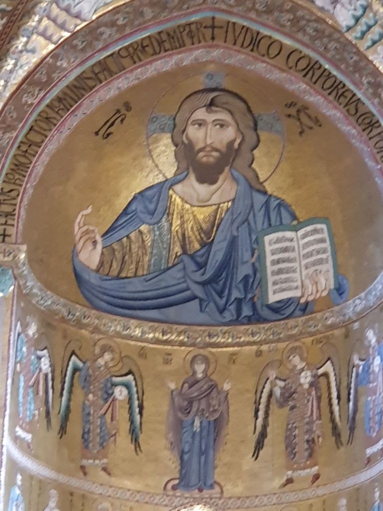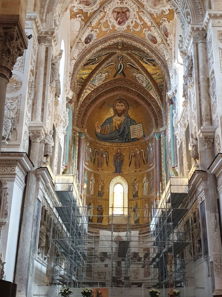 Wir hatten Glück und konnten gerade noch in den Dom hinein, bevor er um 13 Uhr geschlossen wurde. Das Apsismosaik aus dem 12. Jahrhundert des Christus als Pantokrator dominiert die Kirche und strahlt in besonderer Farbenpracht. Die zwischen 1985 und 2002 entworfenen Fenster des Michele Canzoneri mit biblischen Motiven beeindrucken durch ihre Schlichtheit einerseits und die Farbenvielfalt andererseits. Leider lassen sie sich mit dem Handy nur schwer fotografieren.