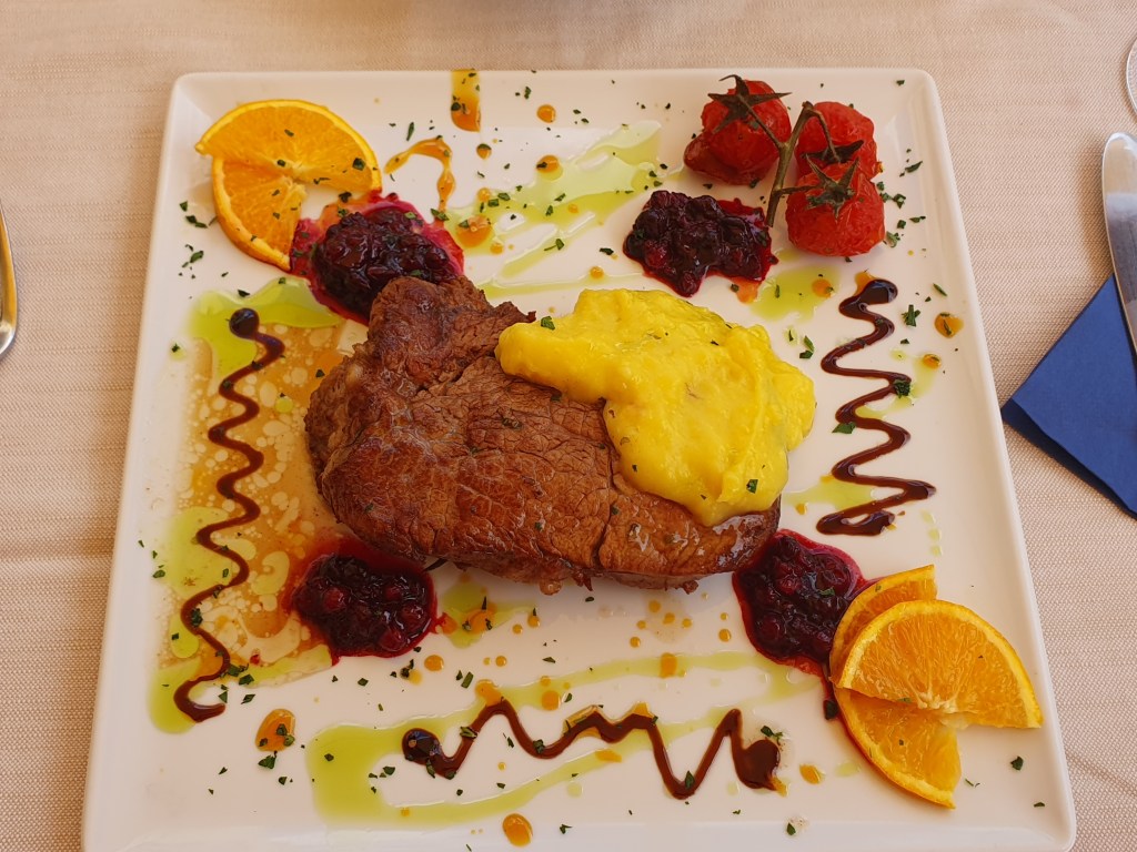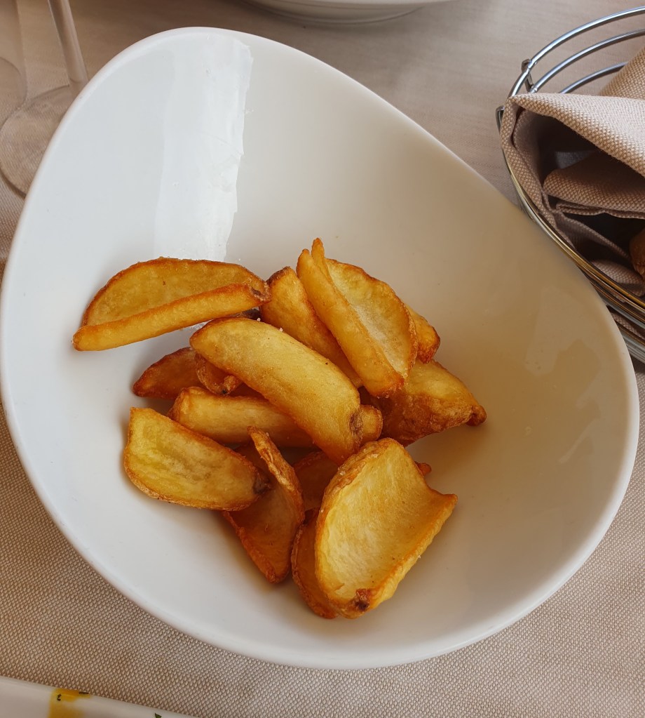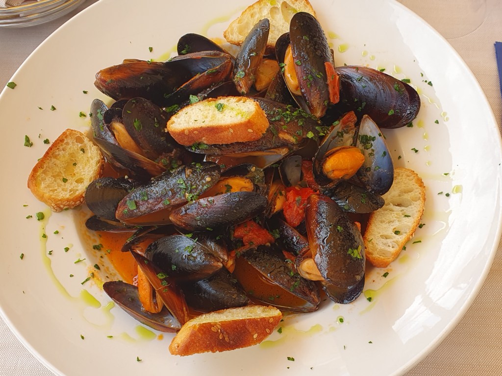 Eine Reihe von Restaurants lud zum Essen ein, im Ristorante Al Pescatore bekam meine Frau endlich die ersehnte Zuppa di Cozze, Muscheln in Tomatensauce, extra zubereitet, obwohl sie gar nicht auf der Karte standen. Auch mein zartes Filetto di Manzo mit Zitronensauce mit frittierten Kartoffelscheiben als Beilage verkürzte die Wartezeit bis zu unserer Rundtour. Glücklicherweise waren wir früh genug da und bekamen noch einen ruhigen Tisch und unser Essen, bevor eine größere Reisegruppe das Personal in Beschlag nahm.