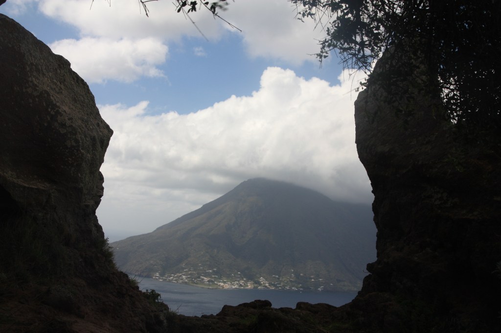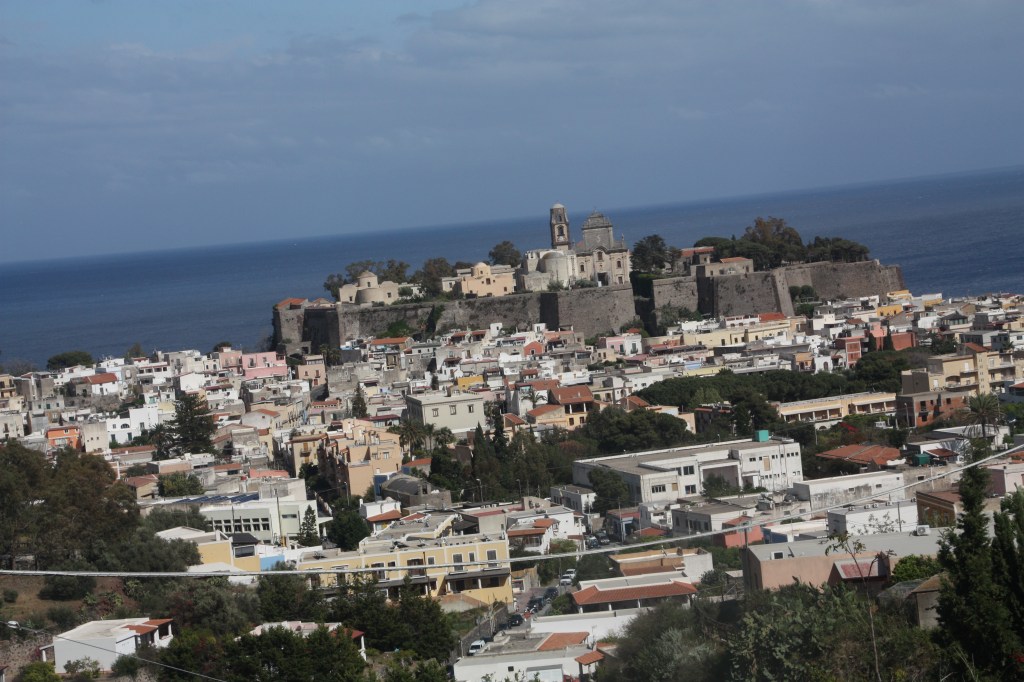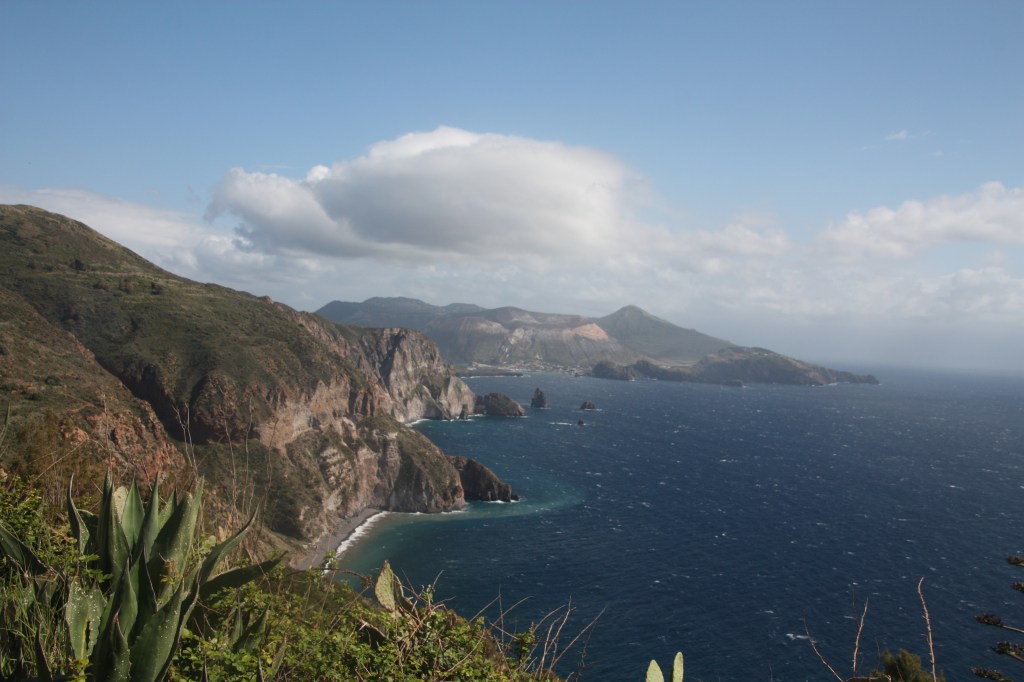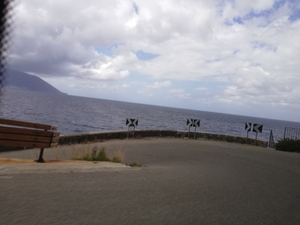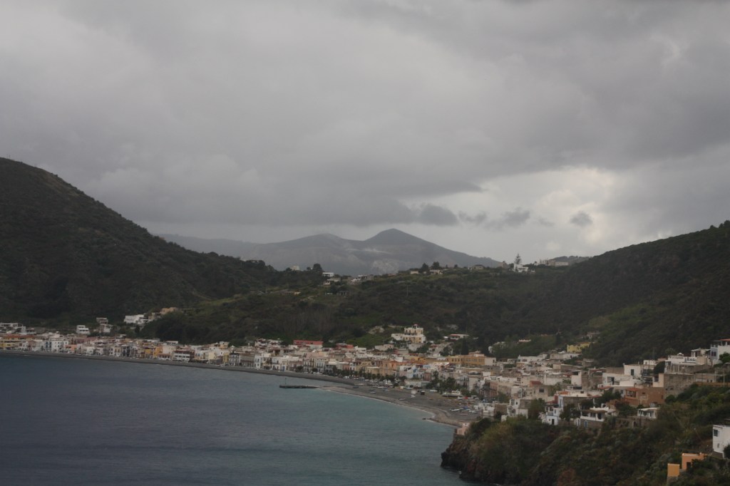 Pünktlich um 14 Uhr holte uns unsere Fahrerin Nadia vom Servizio Taxi Gian.Si. vor der Säule des San Bartolomeo mit ihrem Taxibus ab. Sie erklärte uns die zweistündige Runde zu allen wichtigen Punkten der Insel, wir wurden von ihrer Begeisterung für ihre Heimatinsel auch angesteckt. Die Fahrt führte uns zuerst durch den einzigen Tunnel der Insel nach Canneto mit breiten Kieselstrand und einer Strandpromenade. In den Sommermonaten ist der Ort beliebt für einen Strandurlaub mit Blick auf Panarea und den Vulkan Stromboli, der eigentlich dauernd aktiv ist und in kurzen Abständen speit oder raucht. Wenn es wärmer wäre, würden feine Lavasandstrände am nördlichen Ortsende zum Baden einladen, derzeit ist es auch hier noch zu kalt dazu.