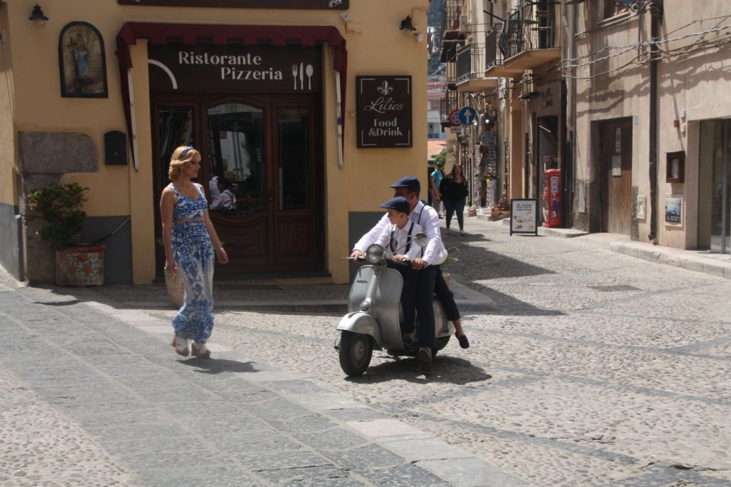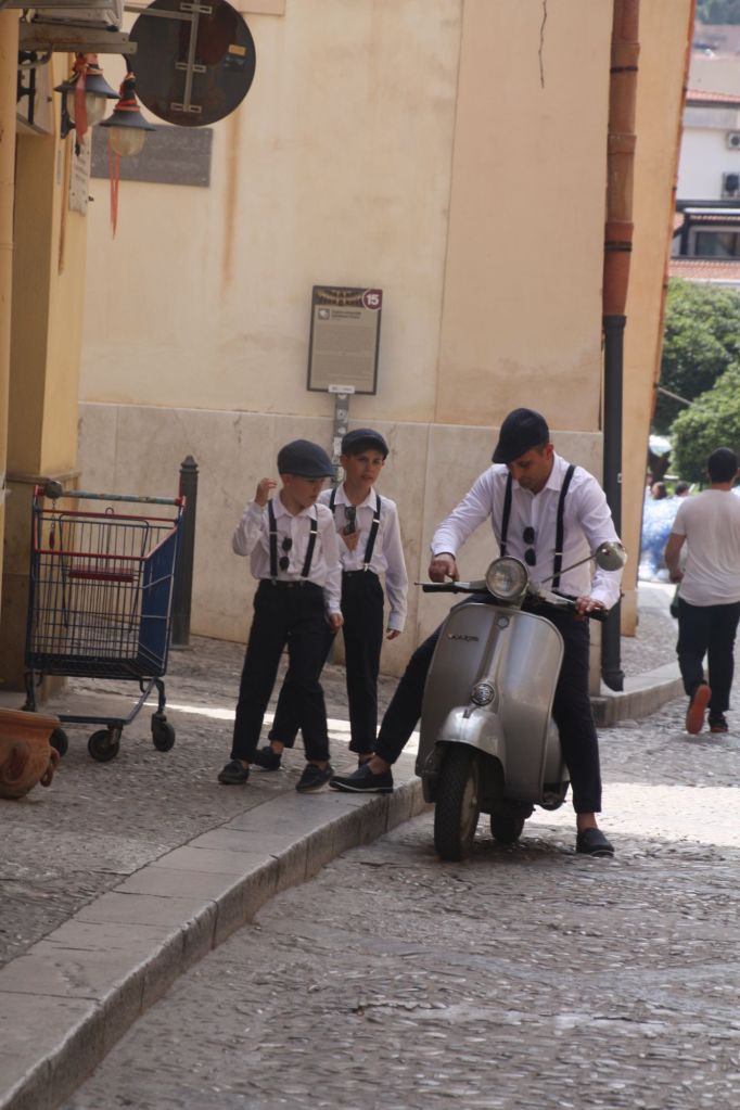 Gleich in der ersten Gasse sind wir zu Filmaufnahmen, wahrscheinlich für einen Werbespot, dazugekommen. Eine Vespa, ein feuriger Italiener, zwei Buben und eine schöne Frau, das alles in Blau-Weiß, waren die Protagonisten.