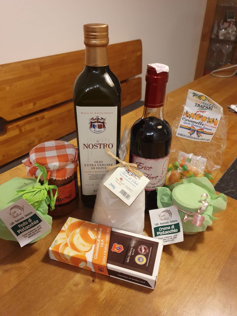 Wenn man schon in Sizilien ist, dürfen kulinarische Mitbringsel auf keinen Fall fehlen, Olivenöl von der Agricultura, wo wir Pizza essen waren, ein spezieller Likör aus Erice, Pesto trapanese und dazu natürlich die spezielle Teigware Busiate, Pistazienpesto und Pistaziencreme aus Brento, Meersalz aus den Salinen zwischen Trapani und Marsala und Schokolade aus Modica dürfen natürlich auch nicht fehlen. Und zum Schluß, der Wein nicht zu vergessen, der kommt noch per Post vom Weingut bei Trapani, wo wir zwei Nächte verbringen durften.