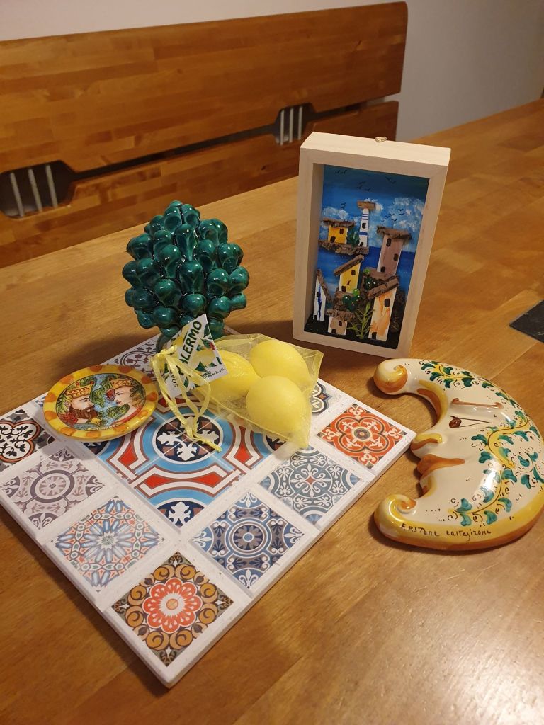 Diesmal wurde es ein Untersetzer aus Trapani mit den typischen Mustern der Fliesen in der Stadt. Unsere große Keramiksonne im Stiegenaufgang daheim bekommt Unterstützung durch einen kleinen Mond eines Künstlers aus Palermo. Das 3D-Bild stammt vom Markt ebenfalls aus Palermo. Der grüne Pinienzapfen mit seinen hundert Samen steht neben einem Willkommensgruß auch für Fruchtbarkeit und Wohlstand, wir werden ja sehen. Und da wir über die Internetplattform „Crowdfarming“ jedes Jahr Bio-Zitronen und Orangen aus Sizilien bestellen, ist noch eine Zitronenseife dazu gekommen.
