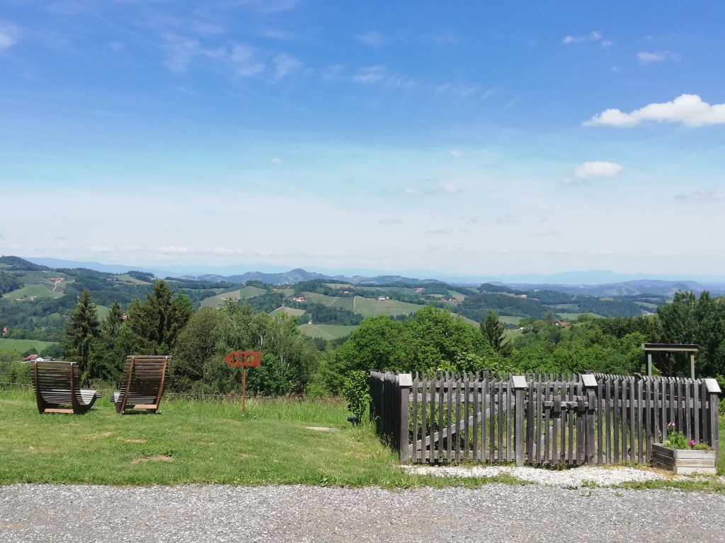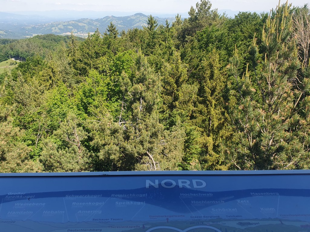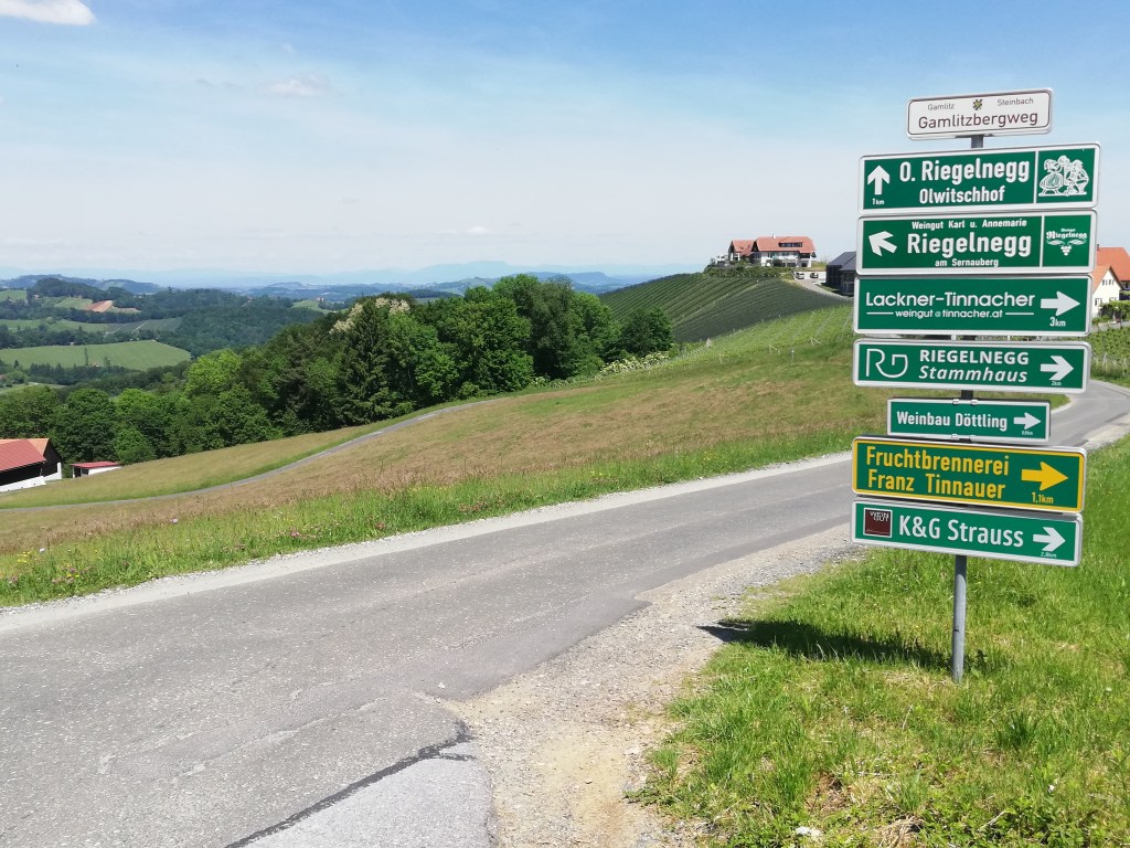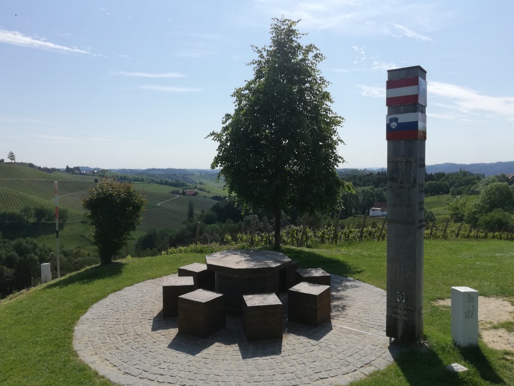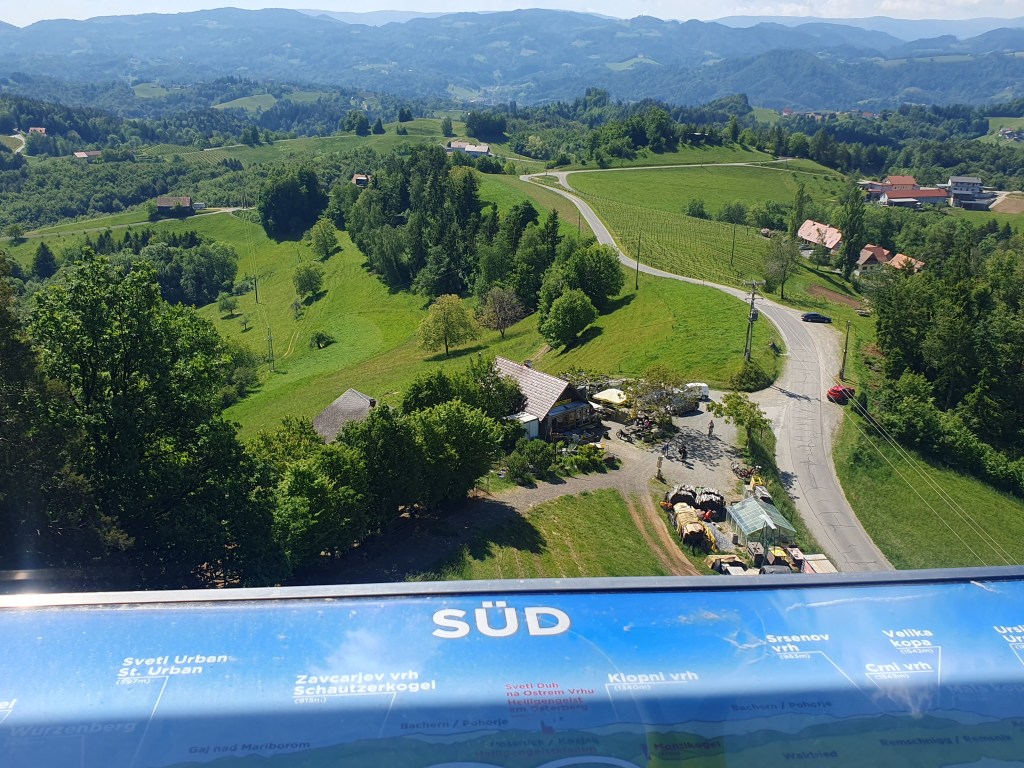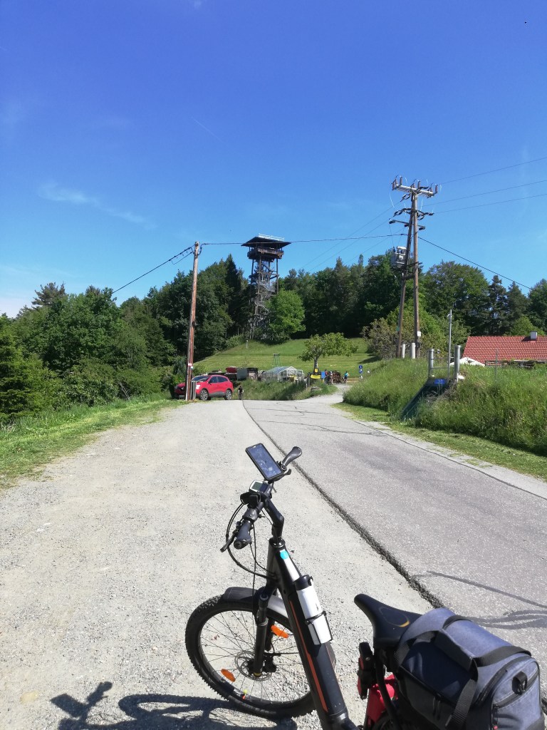 Gleich nach dem Frühstück geht es los, wir wollen die Kreuzbergwarte besuchen. Die Navigation von Komoot will uns gleich nach gut einem Kilometer durch einen abgesperrten privaten Weingarten leiten, da schadet es nicht auch noch selbst ein bisschen die Orientierung und Richtung zu behalten und den Hügel von der anderen Seite zu umfahren. Die Foto-Hotspots, ob markiert oder nicht markiert, häufen sich, die Aussicht links und rechts ist einfach genial. Wir erreichen bald die Kreuzung mit der Bundesstraße am Karnerberg, wo ich mich daran erinnere, daß wir hier vor Jahren auch mit dem Motorrad Halt gemacht haben. Es geht noch ein paar Kilometer rauf und runter und am Ende rauf, bis die Warte, ein 30 Meter hoher Aussichtsturm aus Holz und Stahl vor uns auftaucht. Da das Wetter sehr klar ist, kann man im Nordwesten sogar den schneebedeckten Hochschwab erkennen (wenn man durch die Tafeln am Turm geführt wird) und im Süden in die Berge Sloweniens.