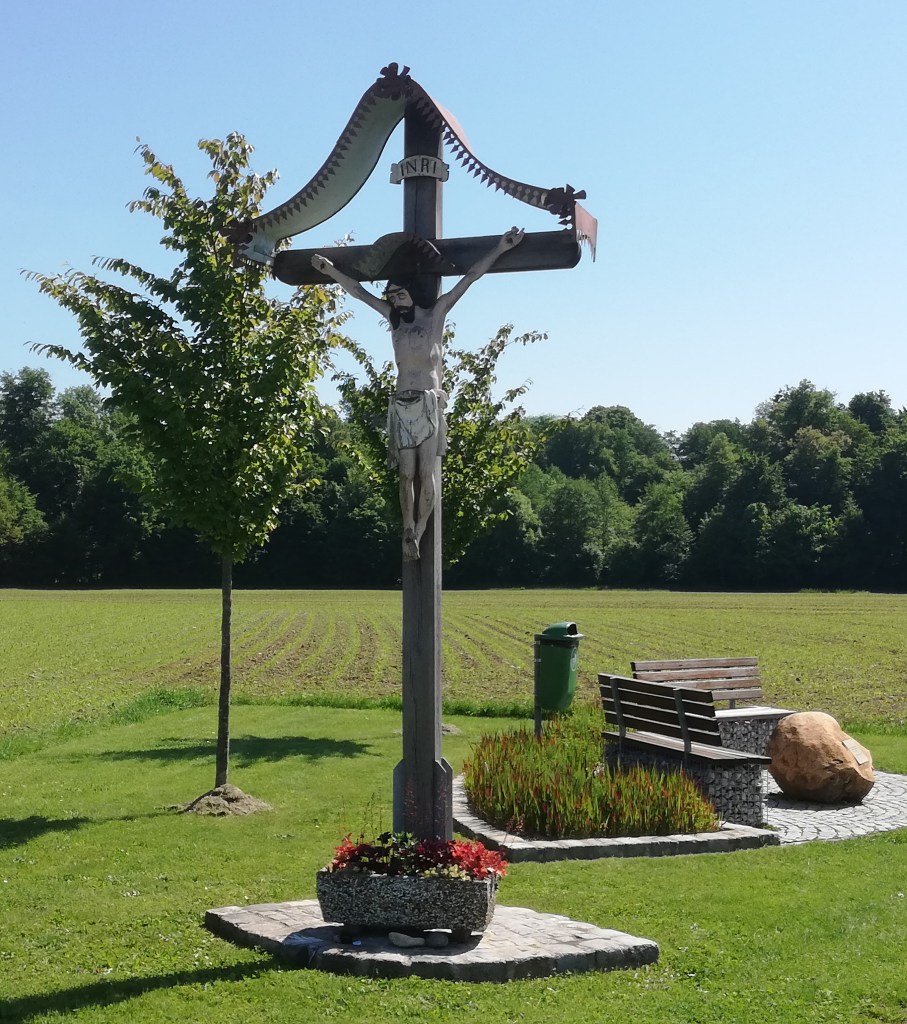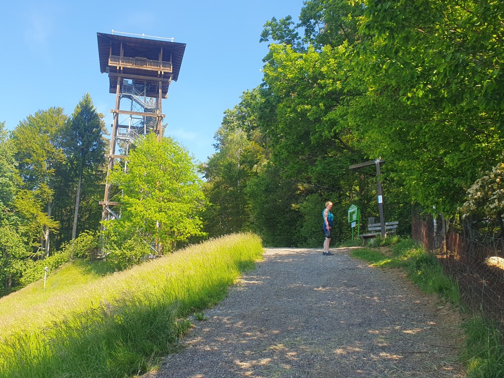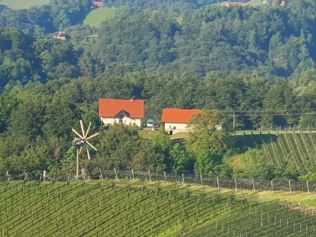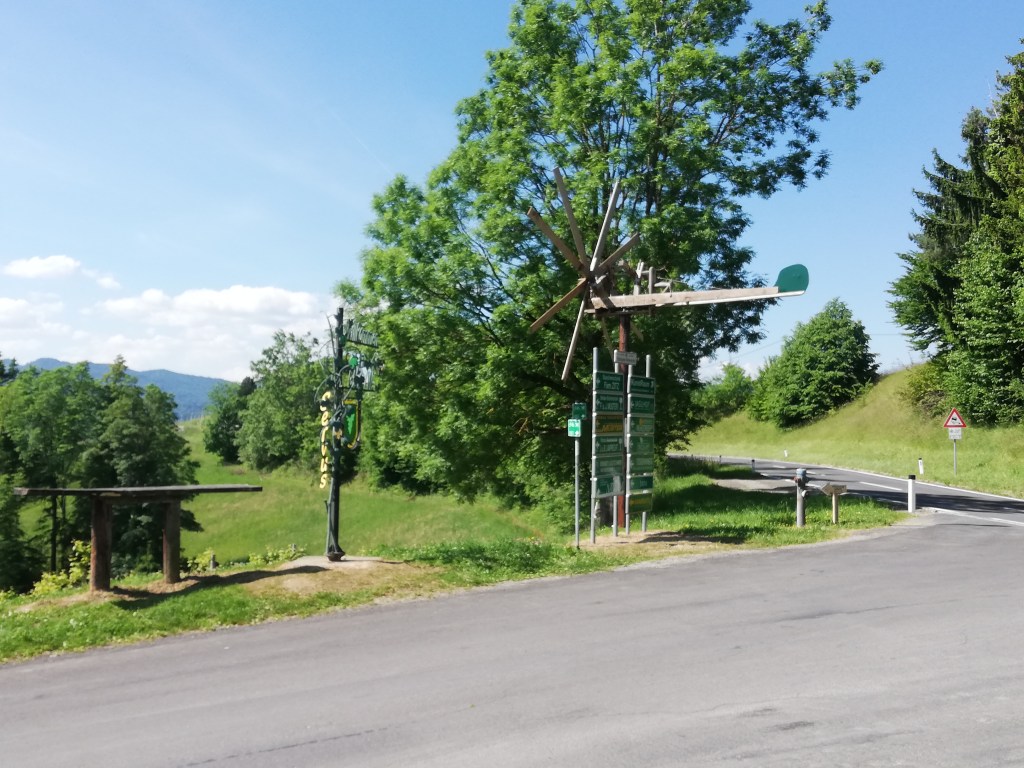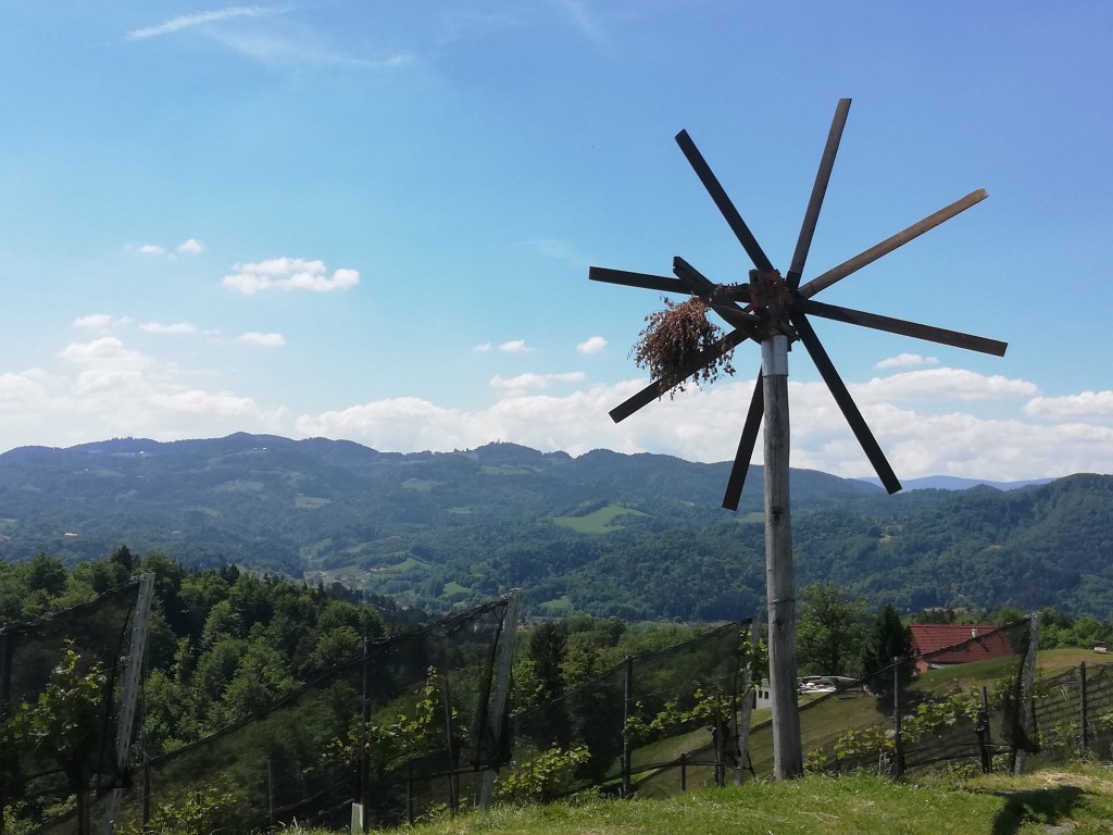 Gleich nach dem Frühstück geht es los, wir wollen die Kreuzbergwarte besuchen. Die Navigation von Komoot will uns gleich nach gut einem Kilometer durch einen abgesperrten privaten Weingarten leiten, da schadet es nicht auch noch selbst ein bisschen die Orientierung und Richtung zu behalten und den Hügel von der anderen Seite zu umfahren. Die Foto-Hotspots, ob markiert oder nicht markiert, häufen sich, die Aussicht links und rechts ist einfach genial. Wir erreichen bald die Kreuzung mit der Bundesstraße am Karnerberg, wo ich mich daran erinnere, daß wir hier vor Jahren auch mit dem Motorrad Halt gemacht haben. Es geht noch ein paar Kilometer rauf und runter und am Ende rauf, bis die Warte, ein 30 Meter hoher Aussichtsturm aus Holz und Stahl vor uns auftaucht. Da das Wetter sehr klar ist, kann man im Nordwesten sogar den schneebedeckten Hochschwab erkennen (wenn man durch die Tafeln am Turm geführt wird) und im Süden in die Berge Sloweniens.