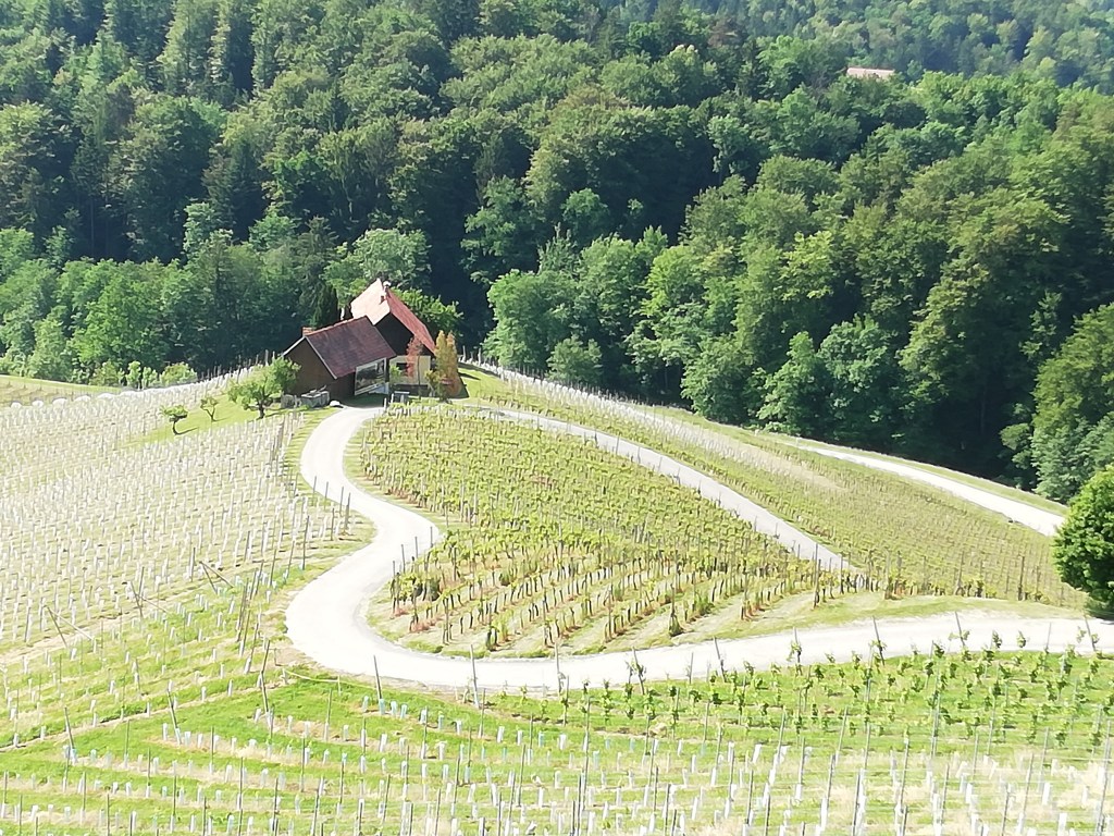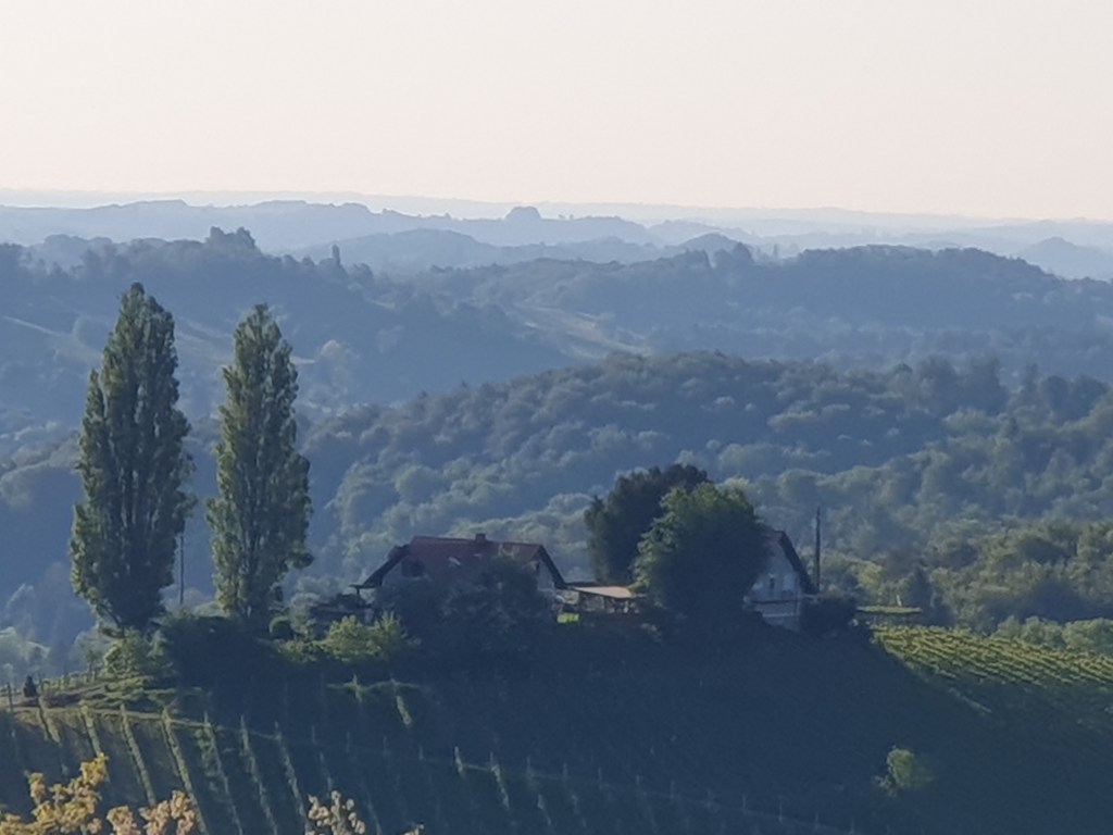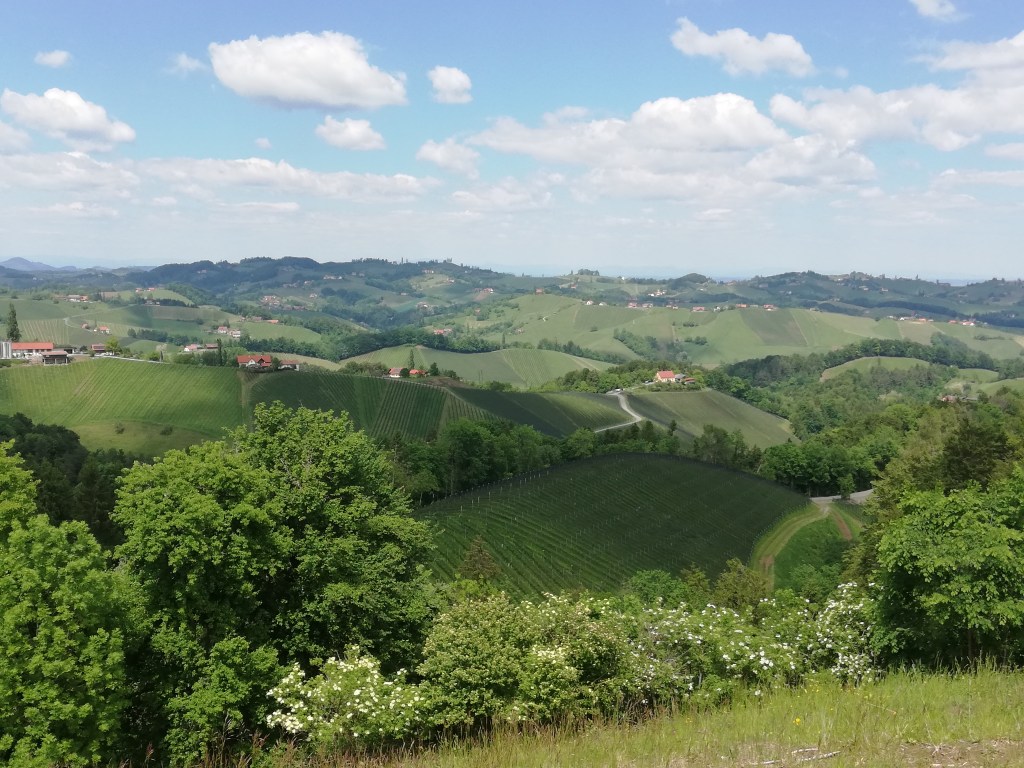 Dann geht’s über die schmale kurvige Straße hinunter bis Leutschach und Schloßberg, von wo wir wieder steil durch den Wald hinauf und über einige Hügel zurück zum Hotel radeln.