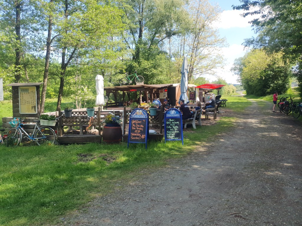 Der Radweg führt nun abwechselnd vorbei an frisch ausgesäten Äckern, wo schon die ersten zarten Triebe erkennbar sind, und durch kühle Auwälder. Immer wieder laden Buschenschanken und Labestationen zu einem gemütlichen Halt ein, wir sind aber noch satt vom ausgiebigen Frühstück und fahren weiter.
