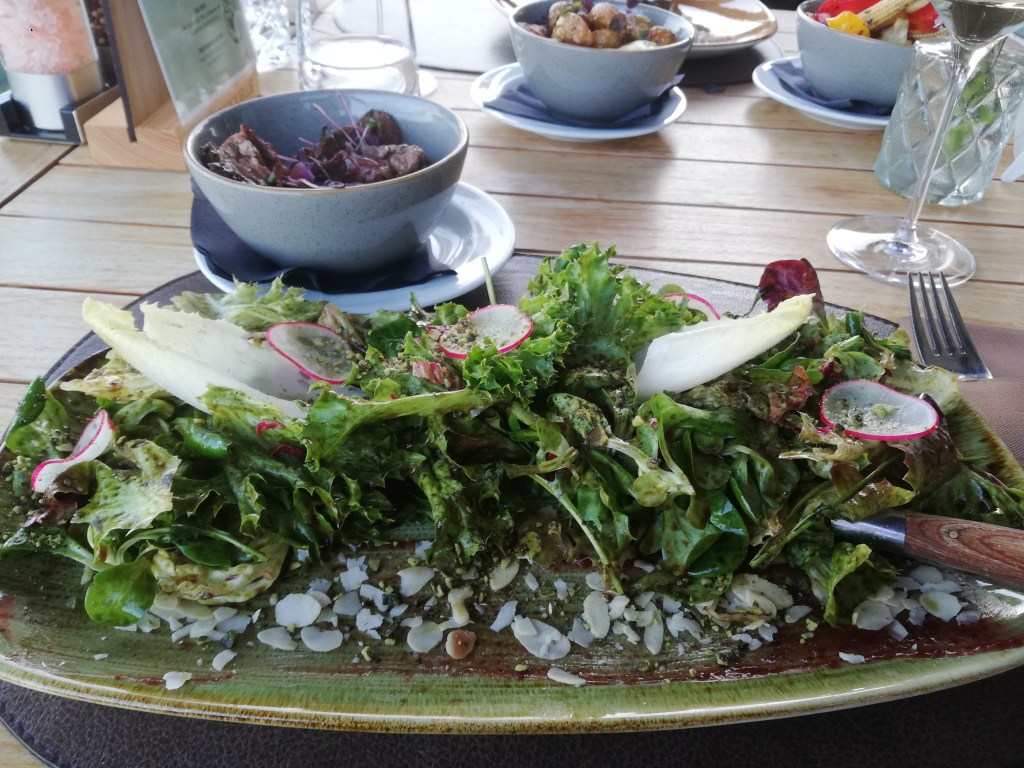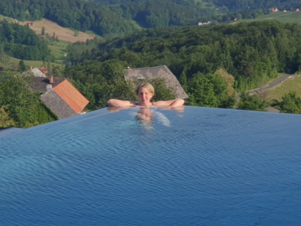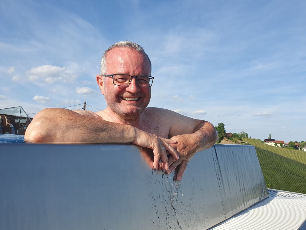 Ein Bad im Infiniti-Pool und ein Saunabesuch mit einem Bad an der Sonne, bis sie hinter dem Hügel verschwindet und es kühler wird, dürfen heute auch nicht fehlen. Wir wollen auch zum Abendessen deftiger weitermachen und besuchen eine wunderschöne Buschenschank, das Weingut Tschermonegg, wo wir gestern mit dem Rad vorbeigekommen sind. Wir bekommen noch den letzten Sonnenplatz auf der Terrasse und bestellen zu unseren vorzüglichen Weißweinen ein Hirschcarpaccio mit Spargel und Steirer-Tapas mit Käferbohnensalat. Für’s Auge lasse ich die Bilder sprechen, den köstlichen Geschmack muß ich euch leider vorenthalten.