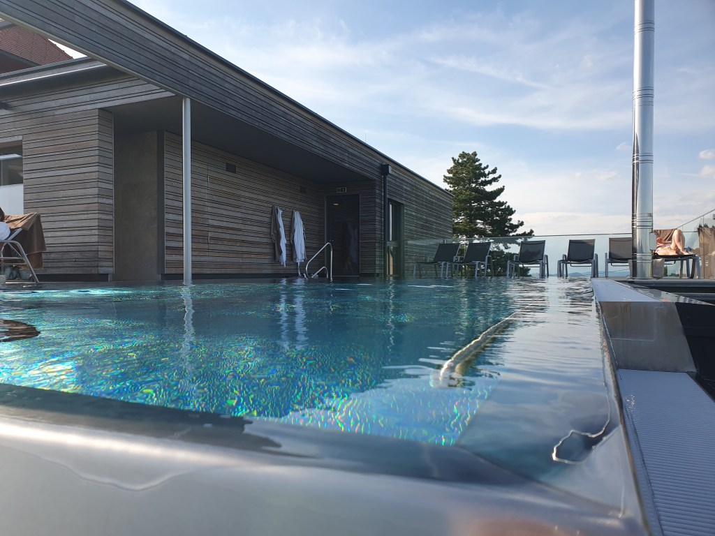 Heute kommt noch ein geheizter Infiniti-Pool dazu, der das Landschaftserlebnis noch toppt. Die Terrasse wurde ebenfalls vergrößert und um eine im wahrsten Sinn des Wortes herausragende Weinbar erweitert.