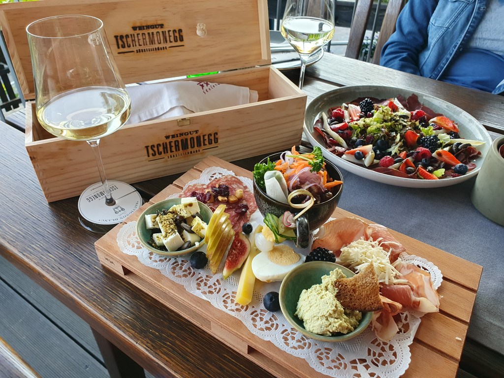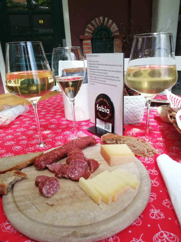 Da zum Abendessen im Mahorko bereits ein Wasserbüffel-Steak wartet, stillen wir unseren kleinen Hunger mit einer exzellenten Hauswurst, einem Stück Stollenkäse aus dem Almenland und einem aufgebackenen Hausbrot zum Hineinknien, wie wir umgangssprachlich sagen. Auch wenn der Wein noch in bester Erinnerung ist (nein, auch damals nicht beim Motorrad fahren, sondern der wurde erst zuhause wirklich genossen), trinken wir dazu einen Trauben-Apfelsaft, zu einer kleinen Kostprobe des ausgezeichneten Frizzante auf Einladung des Hausherren können wir aber doch nicht Nein sagen.