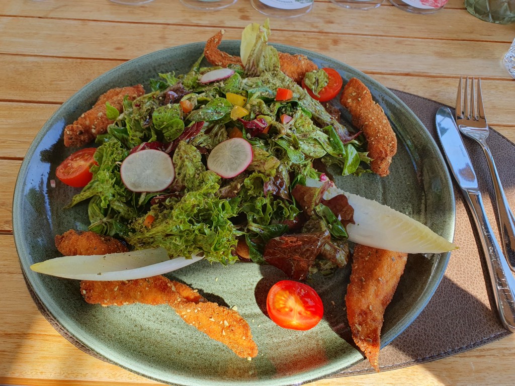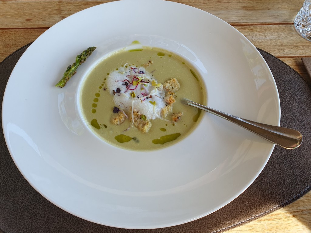 Da es erst kurz nach 12 Uhr ist, rufen noch Pool und Sonnenliegen, bevor wir hungrig werden und nach Spargelsuppe und Backhendlsalat die Weine verkosten. Da wir beide eher genießende Weintrinker als Weinkenner sind, gebe ich hier keine Kommentare oder Empfehlungen ab, ich habe aber trotzdem zwei Sorten gefunden, die mit nach Hause kommen.