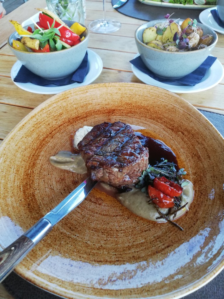 Nach einem kurzen Bad im Pool und einem Saunabesuch mit Ausblick wartet bereits das Abendessen. Das Wasserbüffel-Steak ist butterweich und zart, erinnert entfernt an junges Wild und harmoniert mit den Rosmarinkartoffeln und dem leicht asiatisch angehauchten Gemüse. Ein Glas Wein aus dem eigenen Weingut komplettiert den wunderschönen ersten Tag an der südsteirischen Weinstraße.