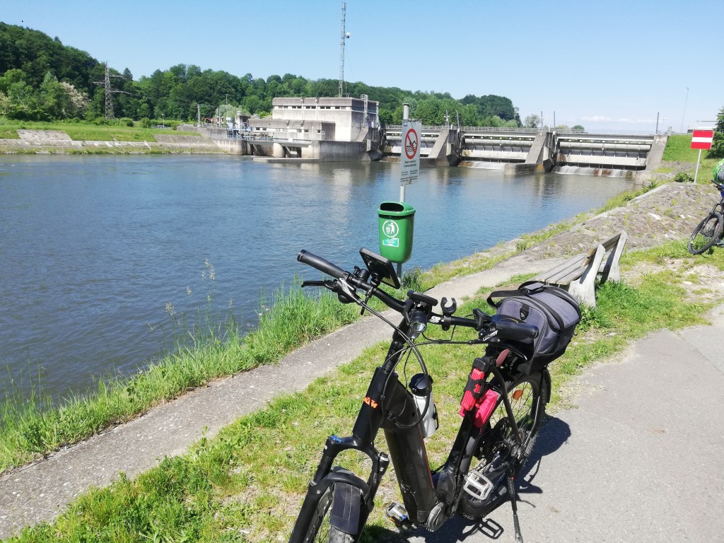Wir starten am Bahnhof von Ehrenhausen, überqueren die Bahn und die Mur und sind schon am Radweg R2 / Eurovelo 9, der bei uns daheim als Thermenradweg entlang des Wr.Neustädter Kanals verläuft und hier noch direkt den Fluss entlang führt. Innerhalb kurzer Zeit durch den blühenden Auwald sind wir bereits nach einem Kraftwerk, das hier die Wassermassen der Mur nützt, bei der Bahnunterführung in Spielfeld und bald darauf unter der Autobahn A9 durch.