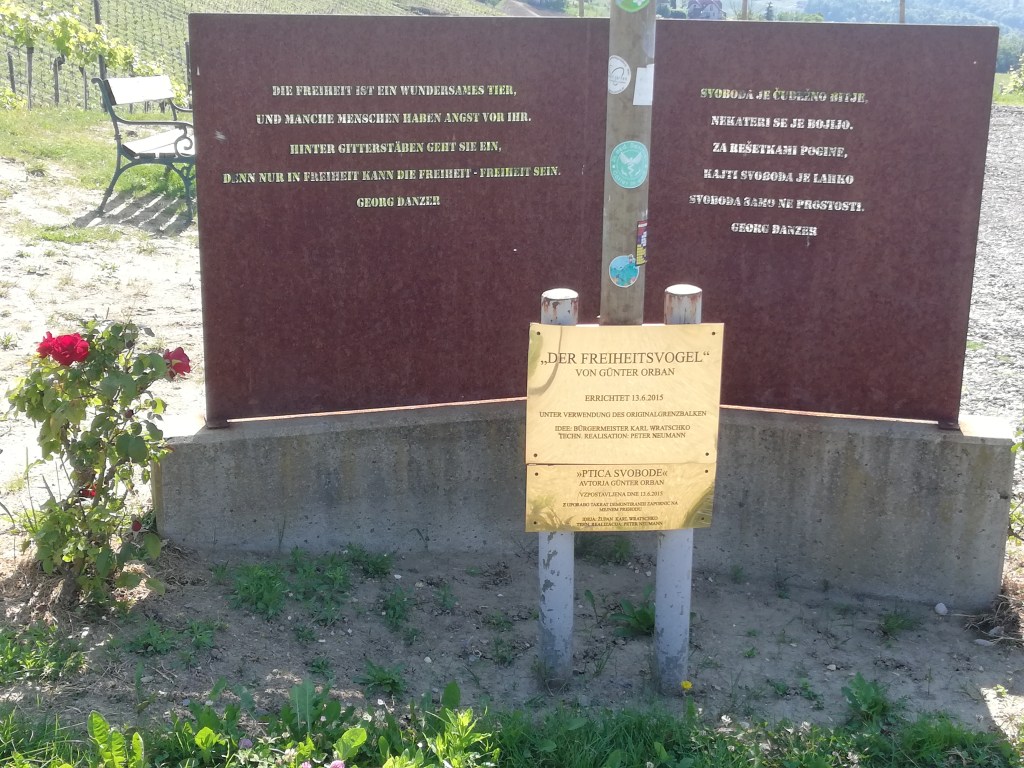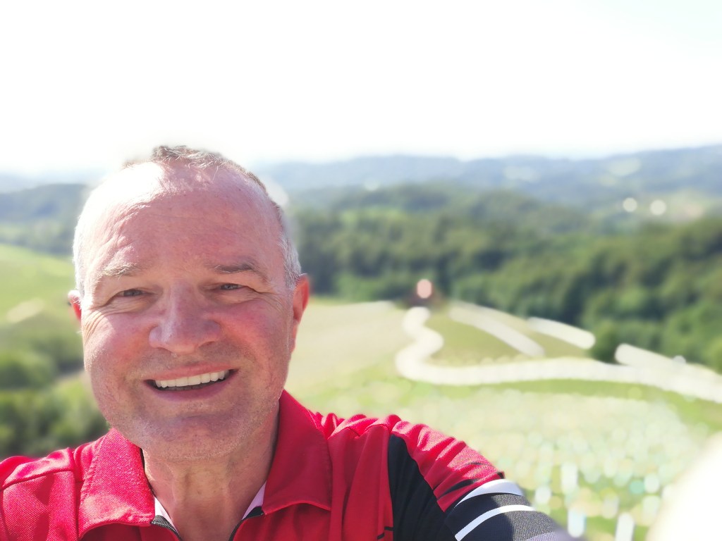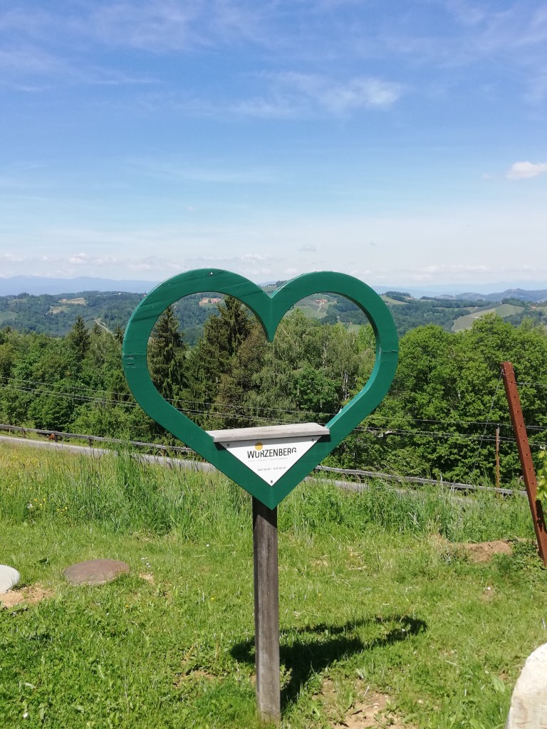 Diese Laune des Blickwinkels, das die Herzerlstrasse genau genommen ist, muß man sich ansehen, wenn man schon in der Nähe ist. Daher besteigen wir am letzten Tag vor dem Heimfahren nochmals die Räder und besuchen die Buschenschank auf slowenischem Gebiet, hinter der die Plattform zum Blick aufs Herzerl hinter einem Drehkreuz versteckt ist, das sich nur nach Einwurf von 5 Euro dem neugierigen Besucher öffnet. Auch wenn man diesen Eintritt dann im Hofladen einlösen kann, ist das doch ein recht heftiger Betrag für einen kurzen Blick, darum gibt’s auch nur ein Selfie von mir allein.