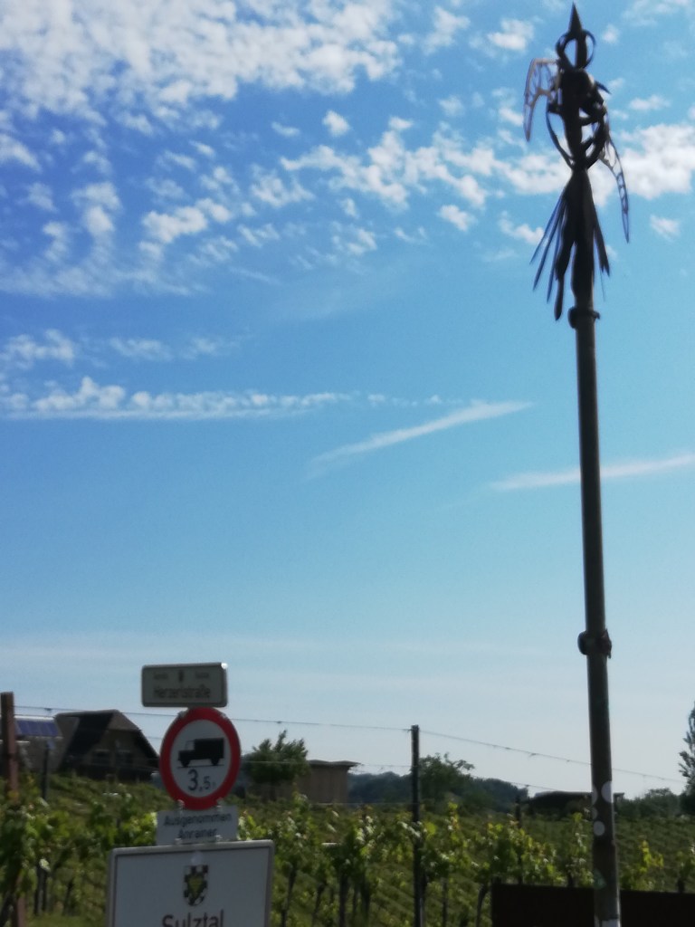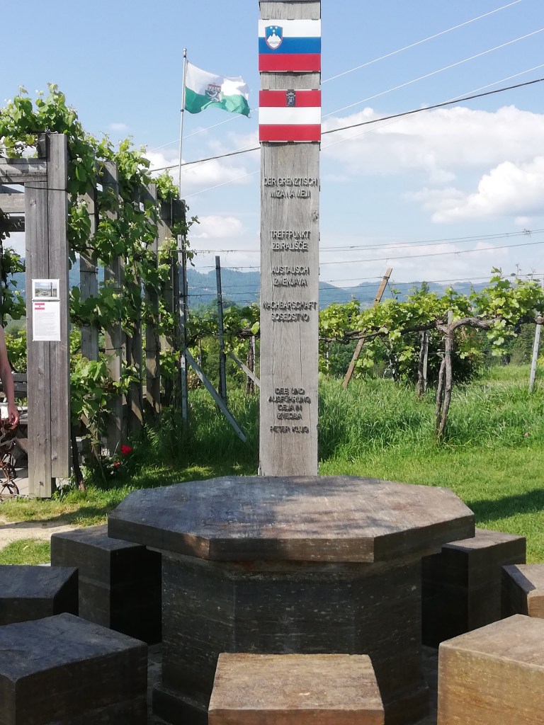 Komoot hätte uns zum nächsten Ziel, dem Grenztisch, durch einen verwachsenen Graben geführt, doch ein netter Einheimischer warnt uns kurz davor. So geht es die steile Straße wieder hoch und ein Stück weiter dafür umso schneller mit 17% Gefälle wieder hinunter, bis wir beim Grenztisch ankommen. Nach einem Fotostopp an dieser Stelle, die daran erinnert, dass hier bis 1918 gar keine Grenze war, fahren wir weiter steil hinunter vorbei an den schon erwähnten Wasserbüffeln und dann auf der anderen Seite an vielen äußerst gepflegten Bauernhöfen vorbei den Berg hinauf, bis wir wieder an der Weinstraße angelangt sind und dort nach etwas mehr als 10 Kilometern und 280 meist recht steilen Höhenmetern zurück zu unserem Hotel fahren.