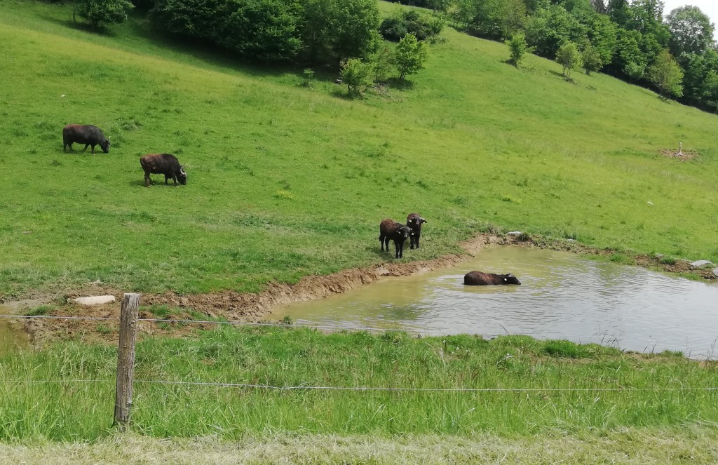 So aber macht es mir und meiner Frau noch viel mehr Spaß, die gar nicht geringen Steigungen hinauf und hinunter zu radeln. Direkt neben dem Hotel führt die alte Weinstraße ins Tal Richtung slowenische Grenze. Bald an der Strecke liegt die riesige Koppel der Wasserbüffel unserer Gastgeber. Nachdem ich erst einmal Wasserbüffel in Natura vor Jahren im indischen Goa erlebt habe, ist es schon eine Freude zu sehen, wie wohl sich diese Tiere auch im südsteirischen Hügelland fühlen können.