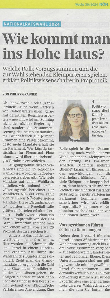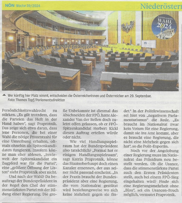 Als Ergänzung zur aktuellen Nationalratswahl 2024 habe ich hier einen Artikel in der neusten Ausgabe der Niederösterreichischen Nachrichten angefügt, in dem die Politikwissenschafterin Katrin Praprotnik erklärt, wie man ins Hohe Haus kommt.