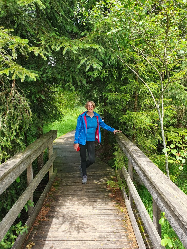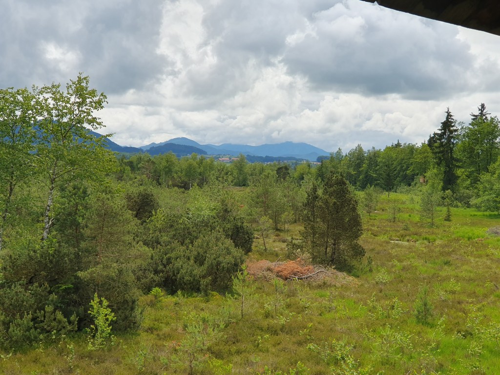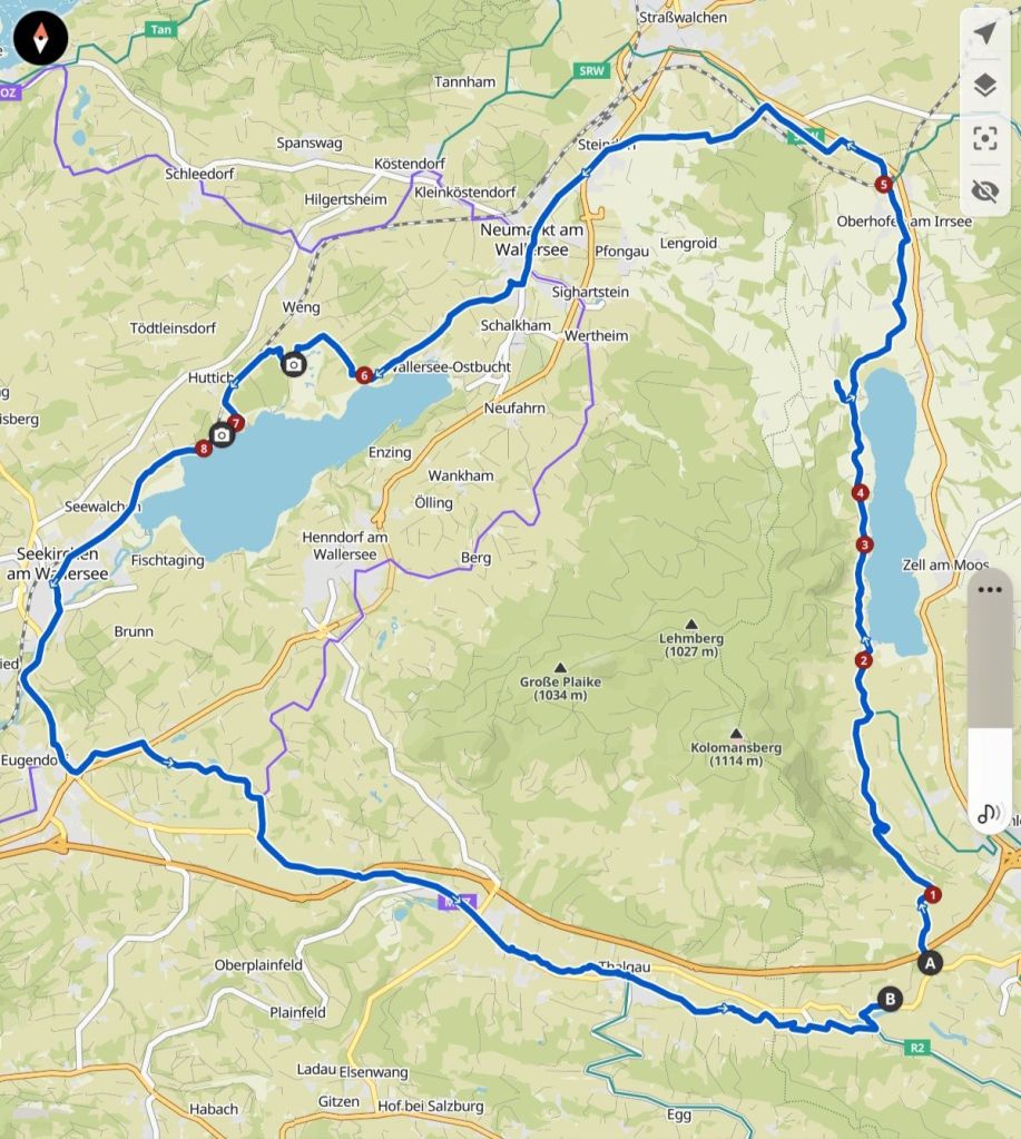 Zuerst mit Blick auf das Irrseemoor, dann immer wieder recht nah am Wasser, fuhren wir das Westufer entlang, bis uns die von Komoot vorgeschlagene Route steil den Berg hinauf leitete. Bei einem Bauernhof endete der Weg in einem Fahrverbot, an das wir uns diesmal hielten und umkehrten um weiter dem markierten Weg zu folgen. Erst in Irrsdorf entschieden wir uns, nicht auf dem R2 durch Strasswalchen, sondern wieder über einen steilen Anstieg die ebenfalls markierte Strecke über einen bewaldeten Rücken hinauf zu fahren, wo wir dann wieder hinunter nach Steindorf und Neumarkt am Wallersee kamen, wo wir uns dann am Hauptplatz einen Kaffee gönnten. Die Markierung führte uns an die Wallerseerunde, wo es ebenfalls am westlichen Ufer entlang durch das Moor mit einer interessanten Aussichtsplattform weiterging.