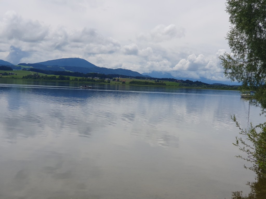 Vom Hotel Eichingerbauer weg fuhren wir eine kleine Straße hinauf und über die Autobahn A1 und wurden dafür mit einem ersten netten Ausblick auf den Mondsee belohnt. Weiter ging es dann leicht bergauf und bergab, bis wir dann auf den markierten Radweg R2 stießen. Auch dieser verlief kleine Straßen und Güterwege entlang, bis wir den Irrsee rechts neben uns hatten.