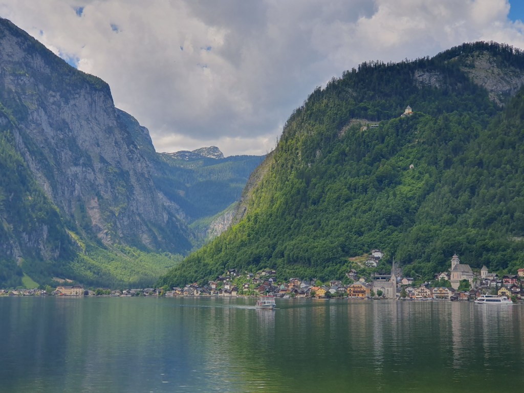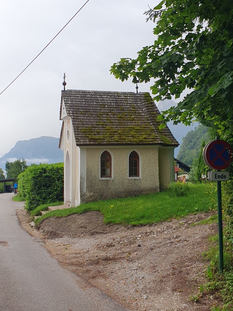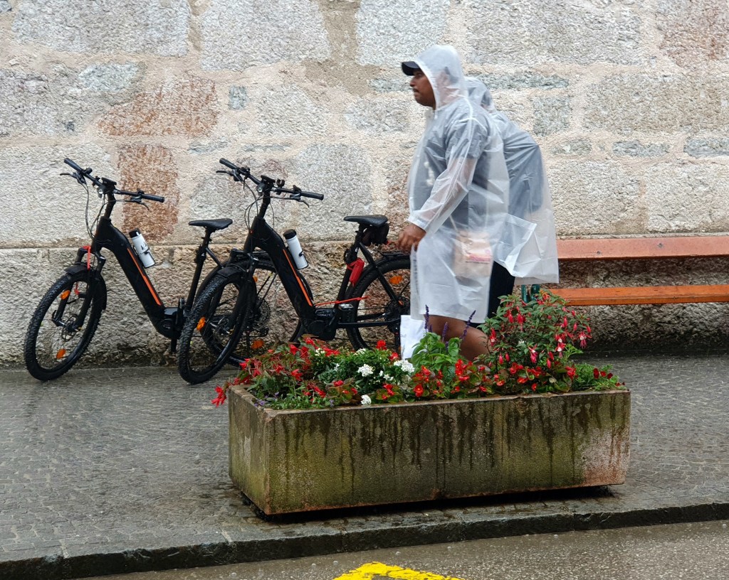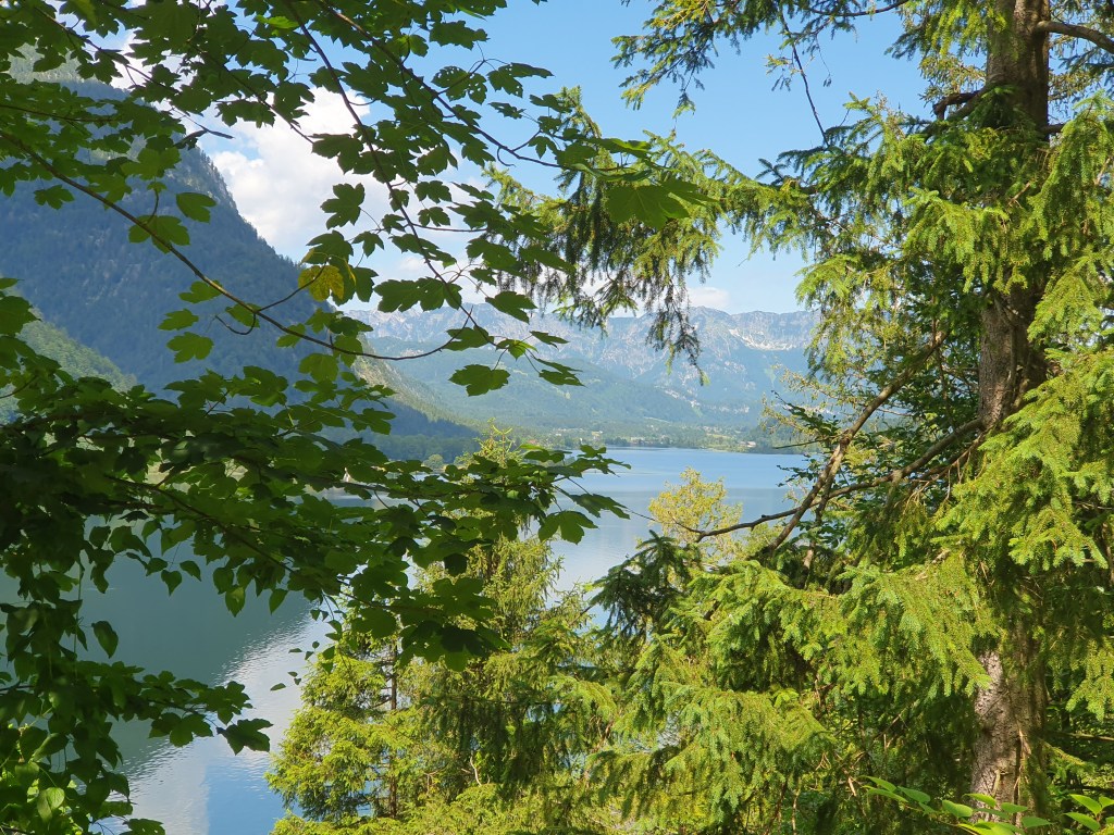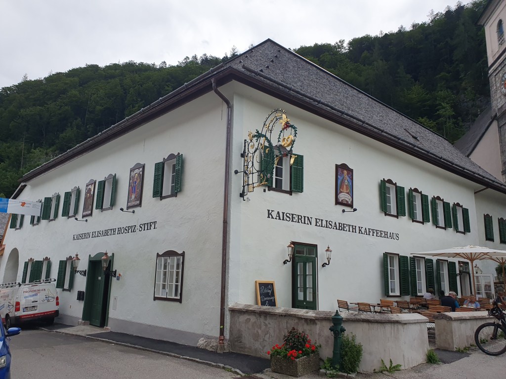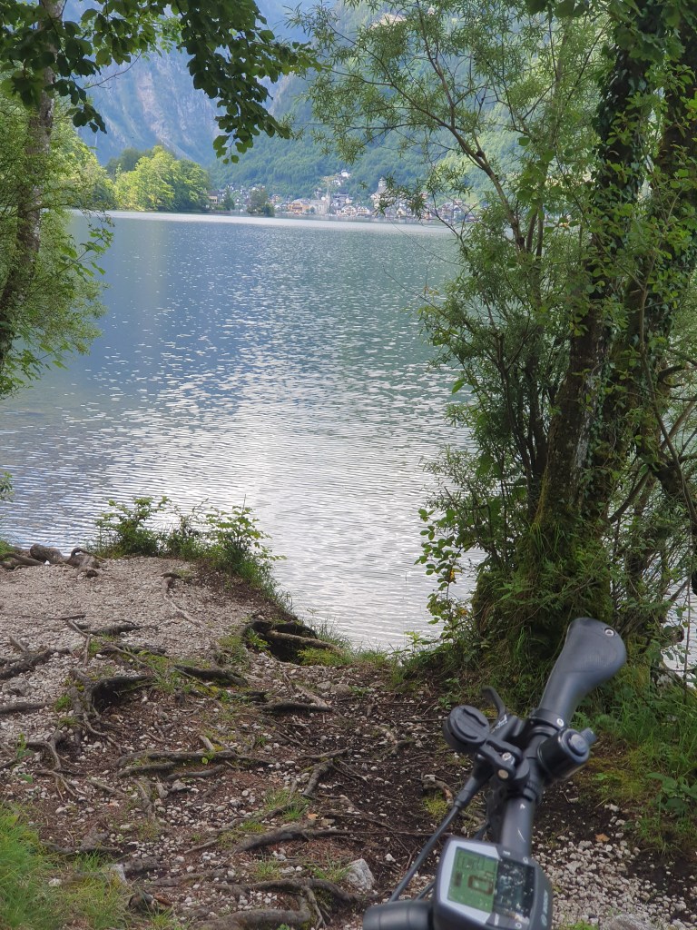 Kurz danach könnte man vom Bahnhof Hallstatt mit der Fähre hinüber ins Städtchen Hallstatt fahren, wir radelten aber weiter bis Obertraun und dann die Straße am Westufer bis Hallstatt. Kaum waren wir in der Fußgängerzone, begann es zu regnen und als wir einen Platz in einem Café ergattert hatten, schüttete es bereits. Wir konnten so im Trockenen abwarten, bis der Spuk wieder vorbei war.