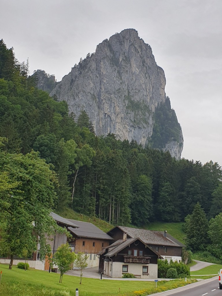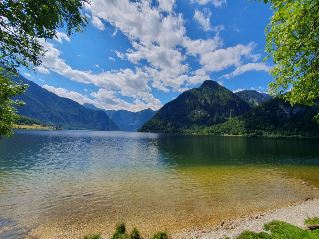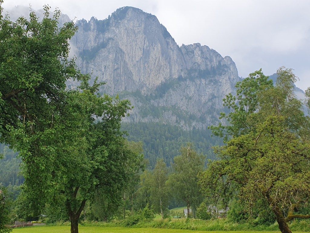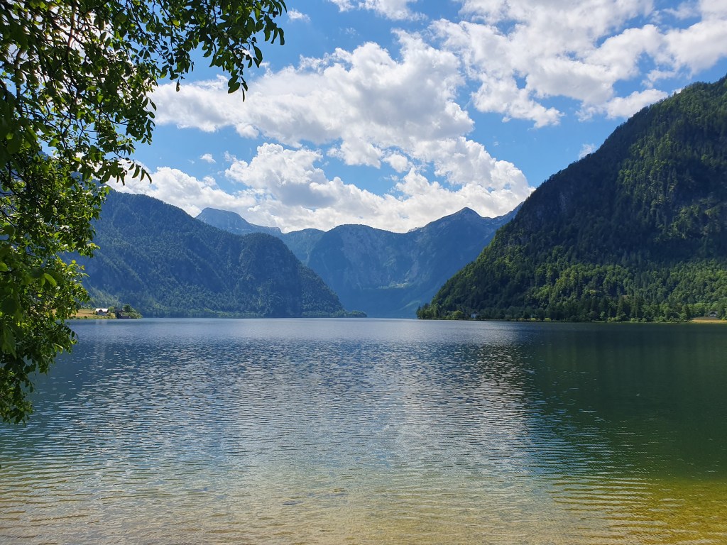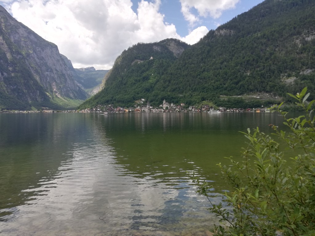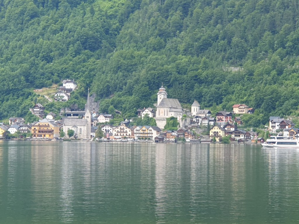 Kurz danach könnte man vom Bahnhof Hallstatt mit der Fähre hinüber ins Städtchen Hallstatt fahren, wir radelten aber weiter bis Obertraun und dann die Straße am Westufer bis Hallstatt. Kaum waren wir in der Fußgängerzone, begann es zu regnen und als wir einen Platz in einem Café ergattert hatten, schüttete es bereits. Wir konnten so im Trockenen abwarten, bis der Spuk wieder vorbei war.