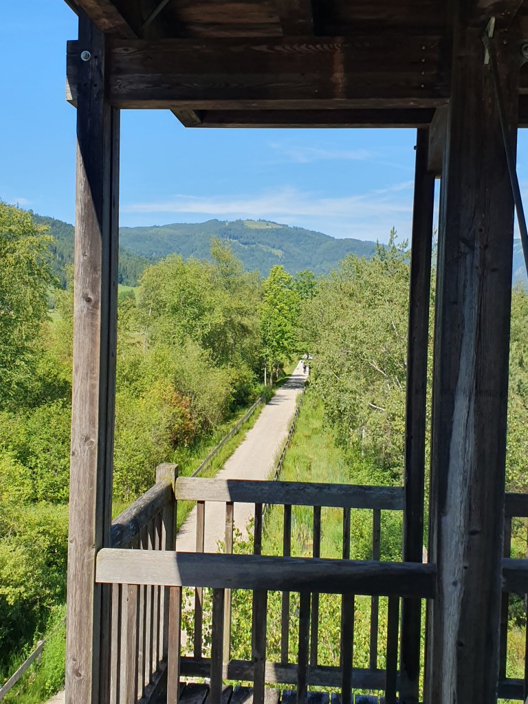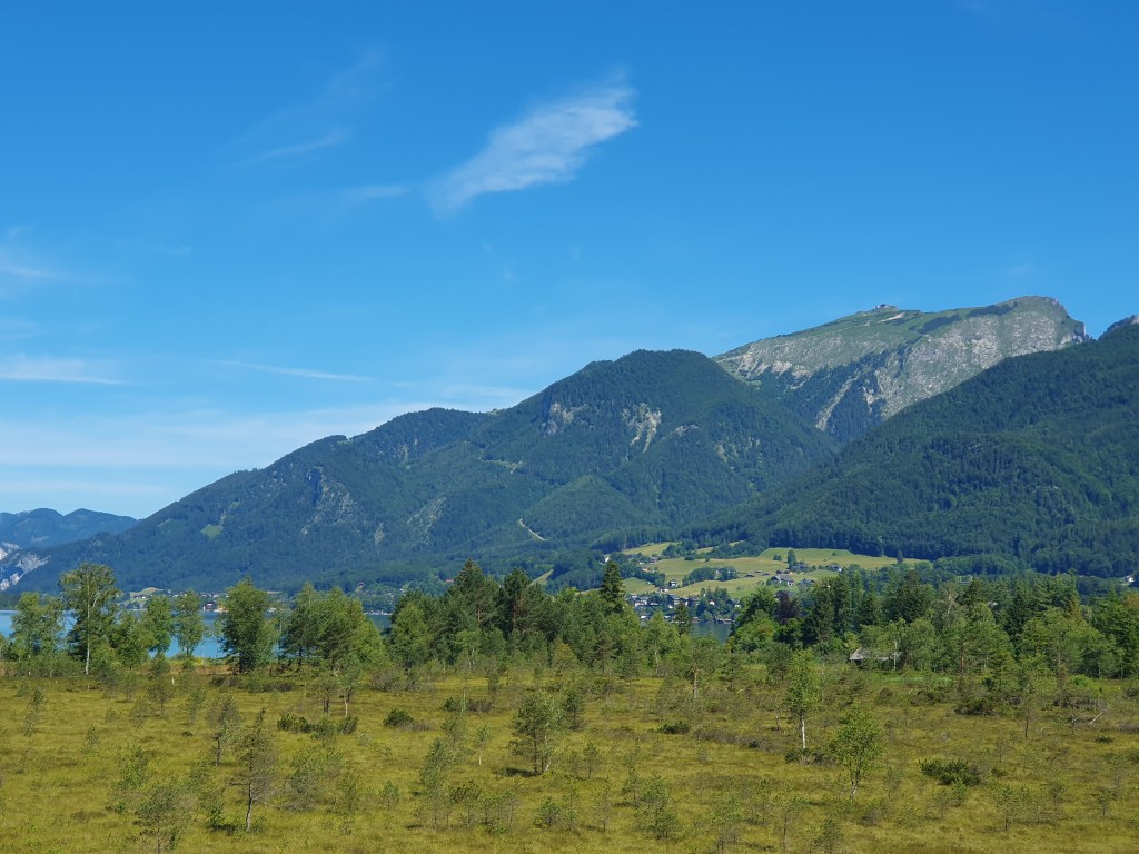 Da wir keine begeisterten Straßenfahrer sind, musste das Auto herhalten und wir stiegen erst in St.Gilgen am Parkplatz bei der Zwölferhornbahn aufs Fahrrad um. Der Radweg führt dann recht abwechslungsreich durch die Orte am Seeufer und weiter durch Uferwälder und Moore mit einem kleinen Aussichtsturm im Blinklingmoos, teilweise auf der ehemaligen Bahntrasse und einem getrennten Radweg neben der Bundesstraße um den Wolfgangsee herum bis ins Zentrum von St.Wolfgang.