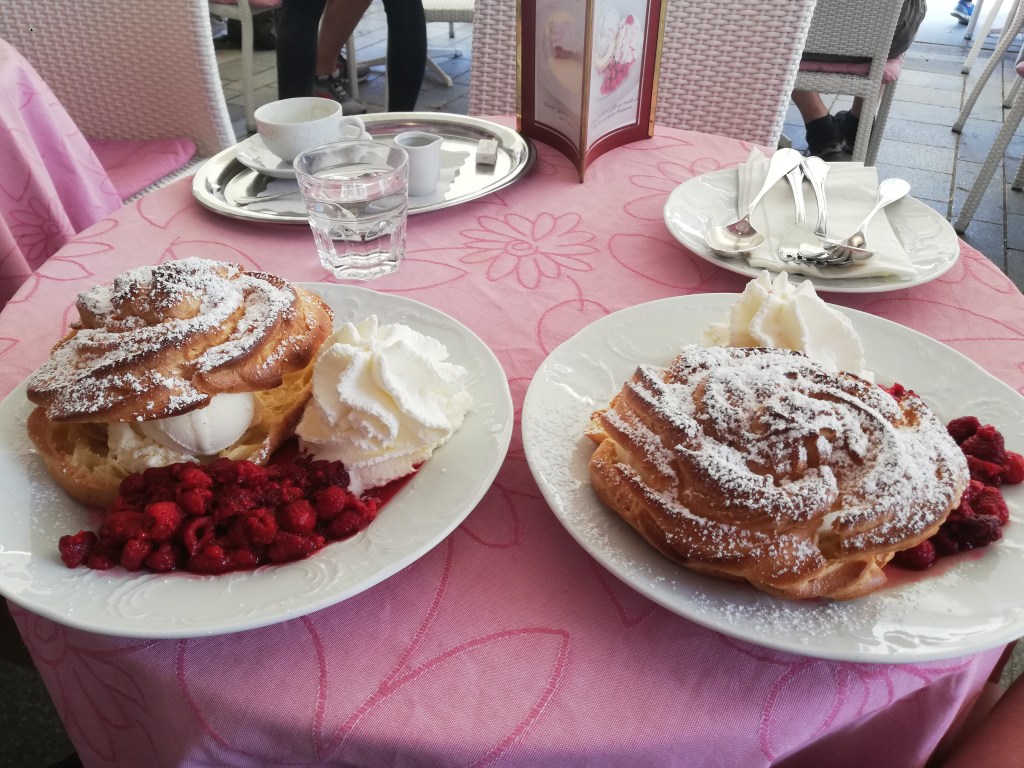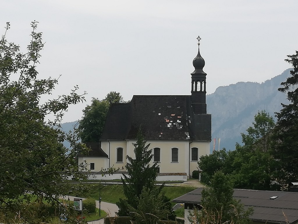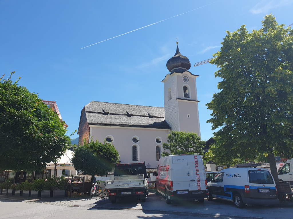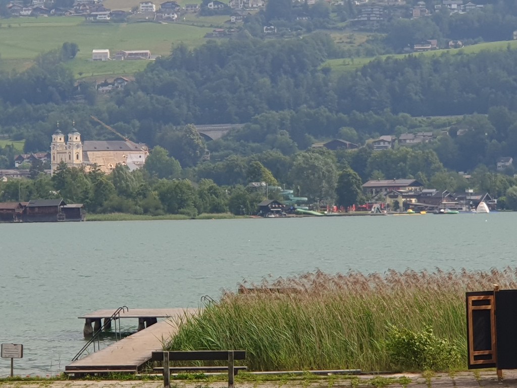 Gleich neben der Kirche befindet sich das Freilichtmuseum Rauchhaus, auf jeden Fall ein Besuch wert, uns war es aber zu heiß. Wir setzten uns stattdessen am Hauptplatz vor der Basilika in den Schanigarten einer Konditorei und genossen als kleinen Snack statt eines Mittagessens einen „kleinen“ Brandteigkrapfen (Windbeutel) mit Eis und Früchten. Den Besuch der Basilika St.Michael, deren Dach gerade erneuert wird, haben wir nicht vergessen, wir waren dort bei unserem letzten Mondsee-Besuch.