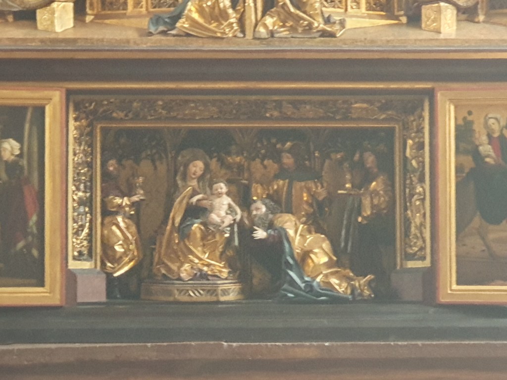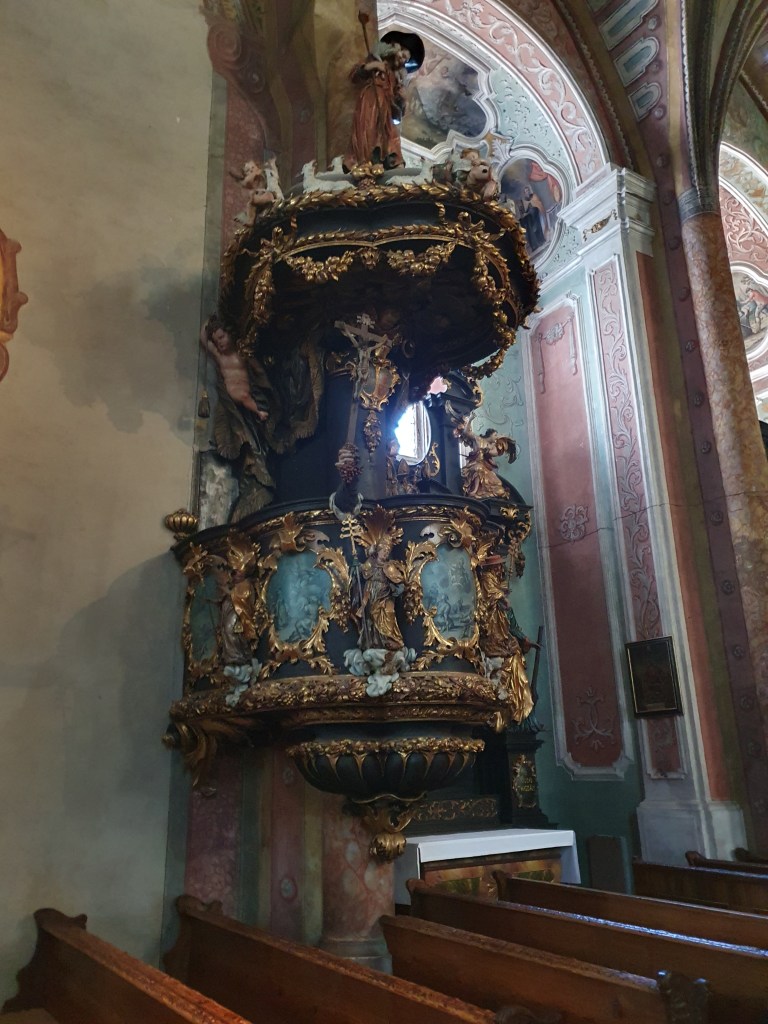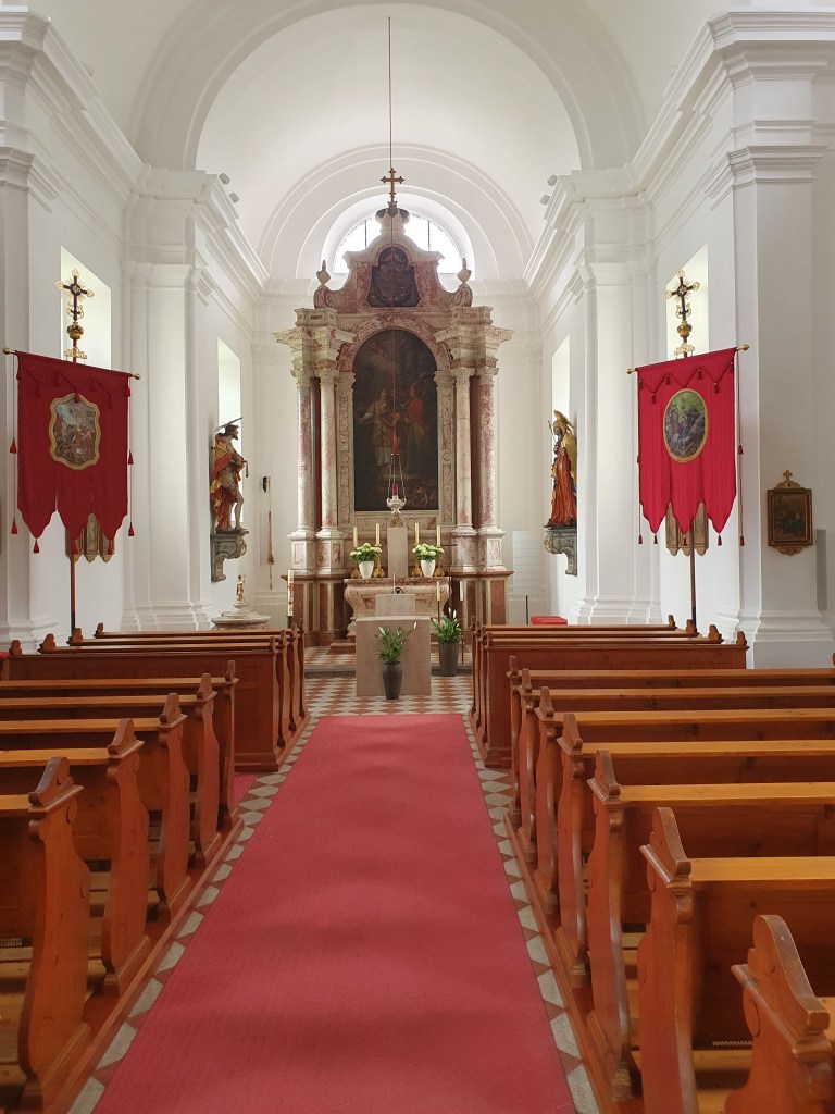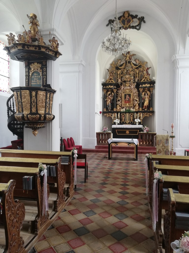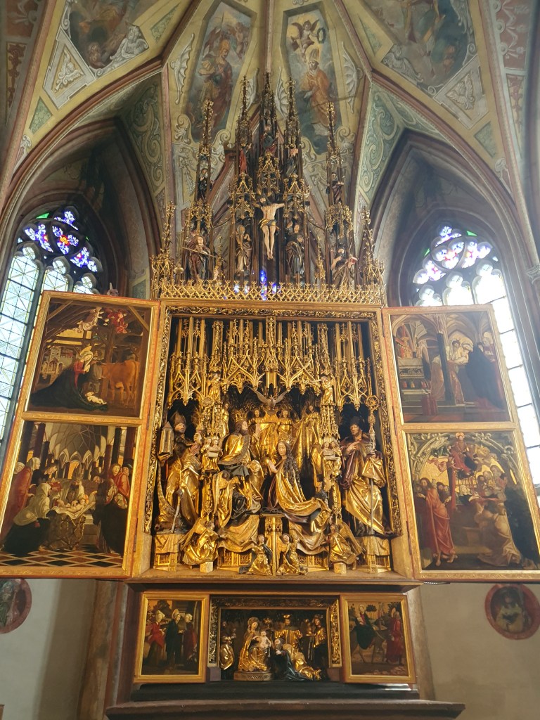 Wir stellten unsere Räder vor der Pfarrkirche ab und statteten ihr einen Besuch ab, um den weltbekannten gotischen Pacher-Altar zu sehen. Die Kanzel stammt von Meinrad Guggenbichler, zu dem ich später noch kommen werde. Aber nicht nur deswegen strahlt die Kirche eine eigene Atmosphäre aus und lockt noch immer als Wallfahrtskirche tausende Pilger an.