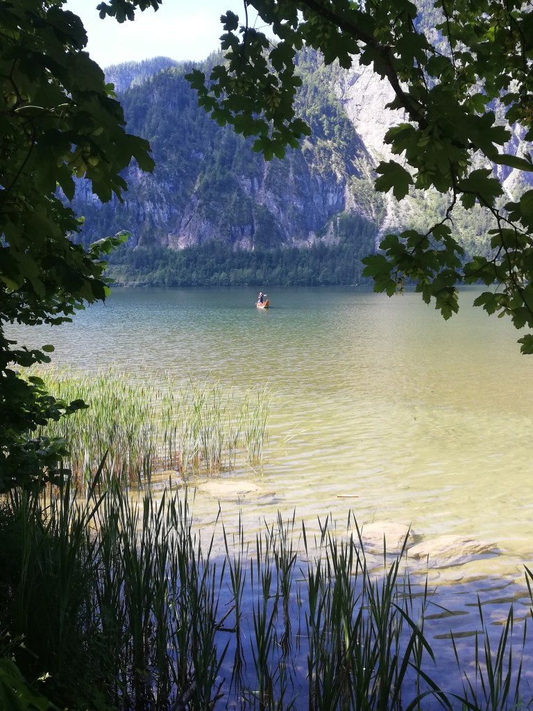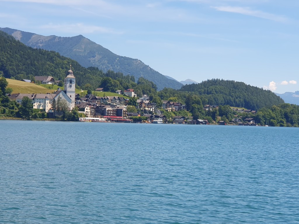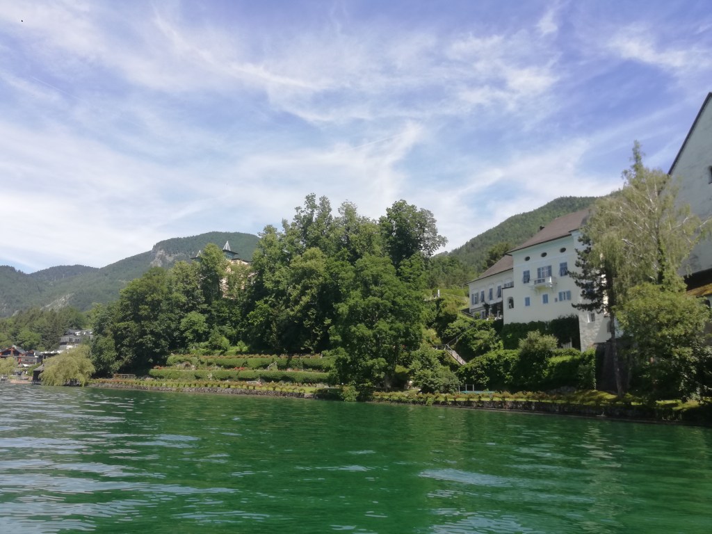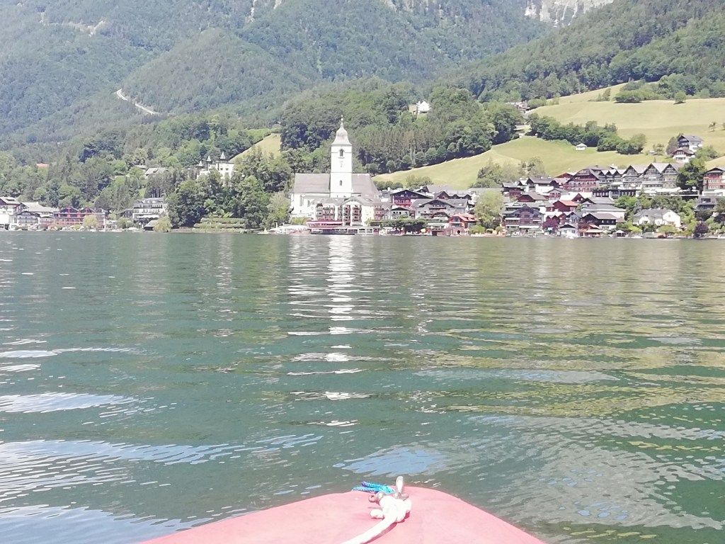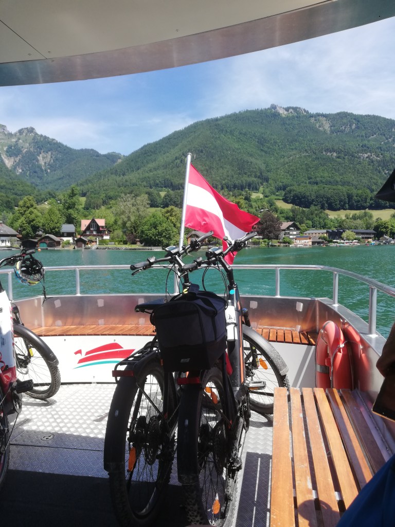 Zum Abschluss unserer Sightseeing-Tour im nächsten Touristen-Hotspot des Salzkammerguts mieteten wir ein Elektroboot um den Ort mit einer romantischen Seerunde auch von dort aus zu bewundern. Hitzebedingt und auch wegen unserer Neugier kürzten wir den Rückweg mit der Fahrradfähre nach Abersee an der engsten Stelle des Sees ab und mussten dann nur mehr gute 5 km zum Auto zurückradeln, nur noch unterbrochen durch einen Stopp beim St.Gilgener Seecafe für einen Eiskaffee, um dann so rasch wie möglich im Hotelpool zu landen.