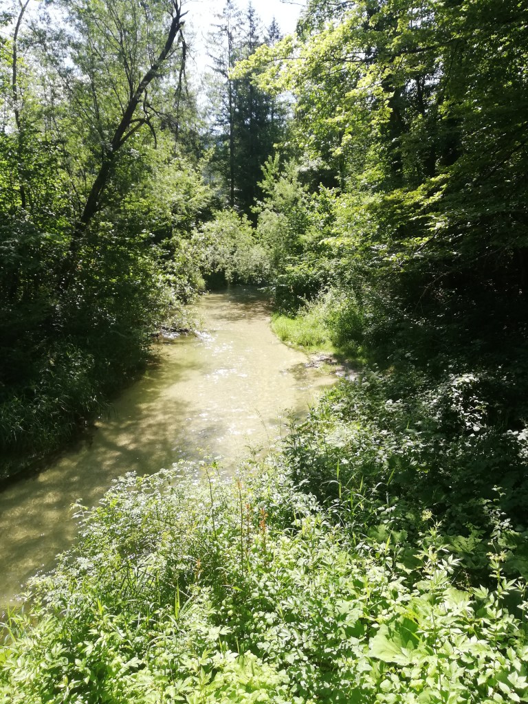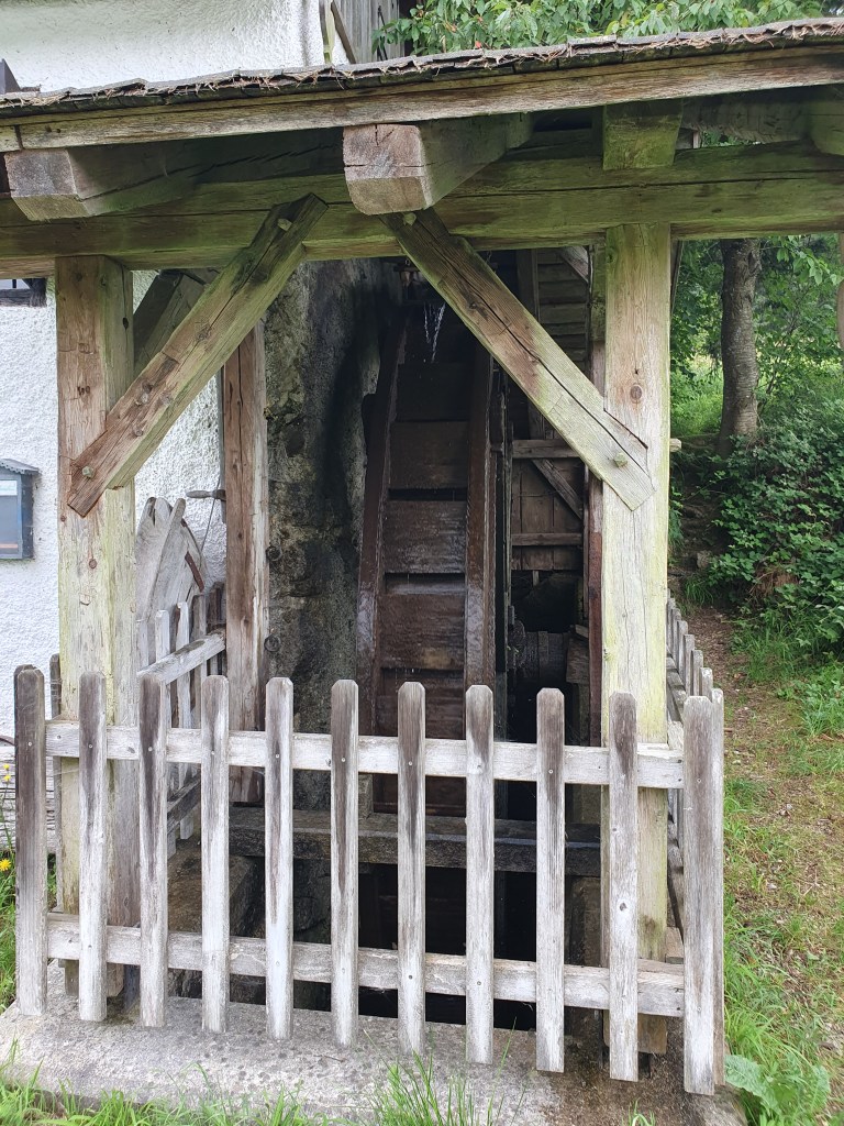 Der Rückweg ging auf der gleichen Strecke bis Schwarzindien, wo wir uns noch im Strandbad einen Eiskaffee gönnten und dann auf einer etwas abweichenden Route über den Hügel zurück zum Hotel fuhren. Unsere Energie war noch nicht ganz weg und so beschlossen wir statt der vom Hotel empfohlenen Wanderung am Helenenweg mit den Bikes zur sogenannten Erlachmühle zu fahren. In der letzten aktiven Mühle des Mondseelandes, die ausgesprochen idyllisch an der Zeller Ache liegt, wird aus dem eigenen Mehl in der Holzofenbäckerei Brot gebacken. Leider waren wir viel zu früh, da die angeschlossene Jausenstation auch erst um 14 Uhr öffnet. Den kurzen Abstecher über die Hügel hinter dem Hotel war es trotzdem auf jeden Fall wert und das Holzofenbrot haben wir dann am Heimweg im Supermarkt gekauft.