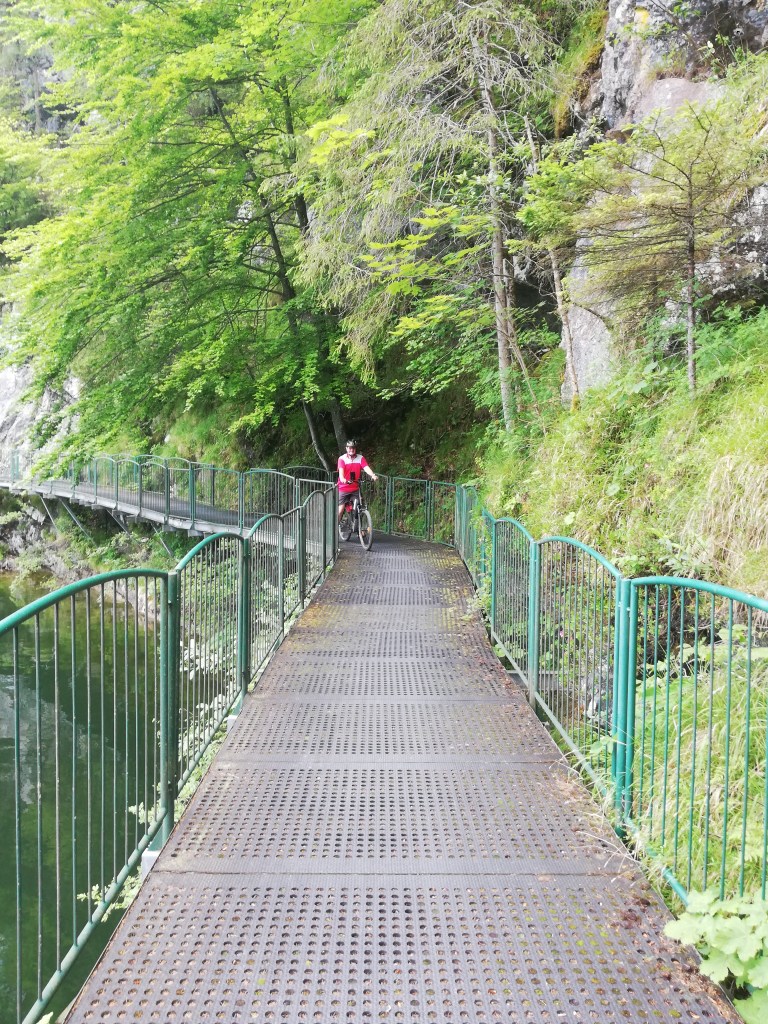 Der Radweg verlief dann weiter durch Bad Goisern und die Bundesstraße B166 bis kurz vor dem Hallstättersee, wo die Straße dem Westufer, der Radweg aber dem Ostufer folgt. Dieser Teil als Rad- und Wanderweg ist sicher einer der schönsten im Salzkammergut und führt mit der spannenden Hängebrücke über eine der tiefsten Stellen des Hallstättersees mit 125,2 m Wassertiefe.