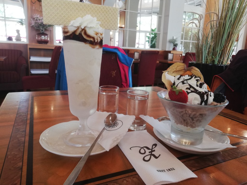 Kurz vor Bad Ischl regnete es nochmals, wir schafften es aber noch relativ trocken bis zur Konditorei Zauner an der Esplanade, wo uns ein Eiskaffee die Wartezeit bis zum Ende des Regens verkürzte.