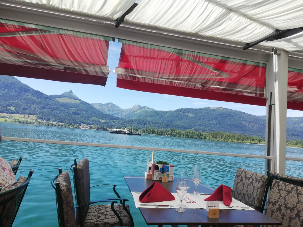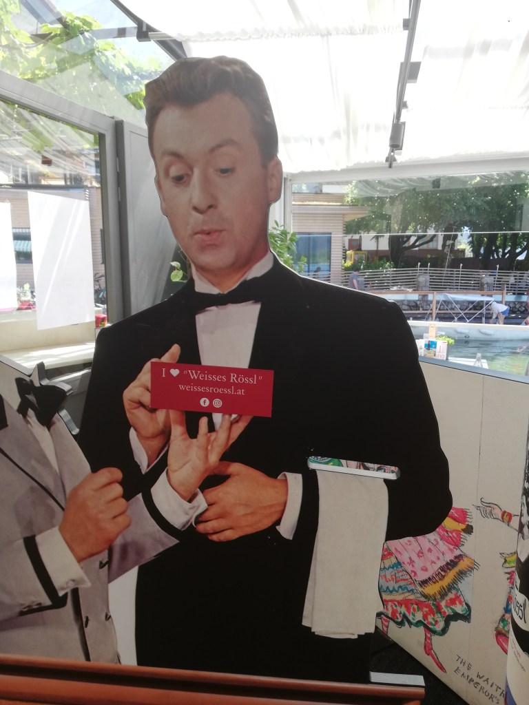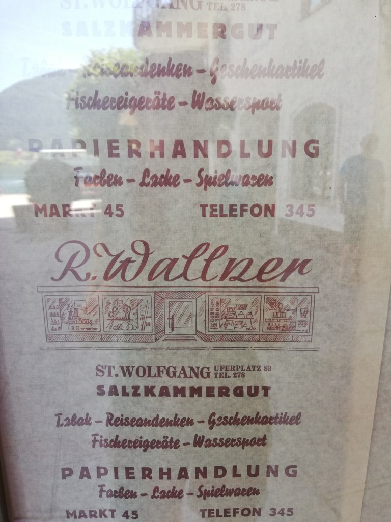 Wenn man schon in St.Wolfgang ist, muß man natürlich auch ein weiteres Highlight des Ortes besuchen, nämlich das von der Ralf Benazky Oper bekannte Hotel „Weisses Rössl“, wo wir uns auf der Terrasse eine nicht sehr günstige, dafür aber auch nicht besonders aufregende Melange gönnten. Der Platz auf der Seeterrasse entschädigte dafür. und, wie ich gerade entdeckte: „meine“ Papierhandlung ist auch nur mehr Geschichte ….