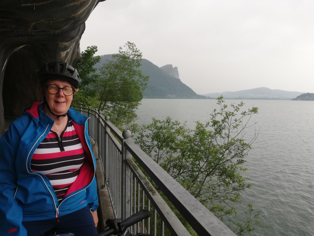Eigentlich war ja eine Fahrt auf den Dachstein-Krippenstein geplant gewesen, aber ohne adäquate Kleidung für die Eishöhle einerseits und wegen des bedeckten Wetters andererseits entschieden wir uns zum Abschluss des Urlaubs nochmals für eine Radtour, diesmal am Südwestufer des Mondsees den Radweg an der B154 entlang bis zur Abzweigung nach St.Gilgen und dann weiter zum 2004 errichteten Fahrradtunnel.