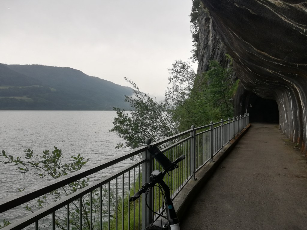 Der 1168 m lange Tunnel ist asphaltiert und perfekt beleuchtet und dazwischen immer wieder zum See hin offen. So ist es es auch für etwas ängstlichere Menschen kein Problem durchzufahren und trotzdem nicht unspektakulär. Gleich am anderen Tunnelende befindet sich der Kreuzstein und der baulich getrennte Radweg endet hier auch schon wieder.