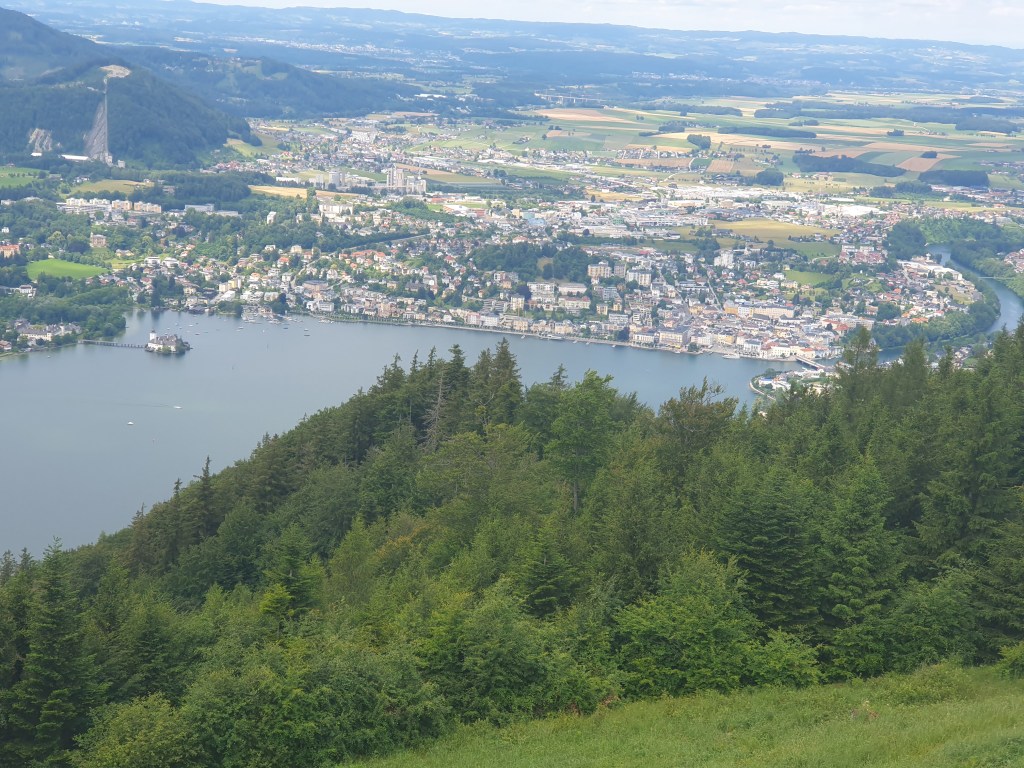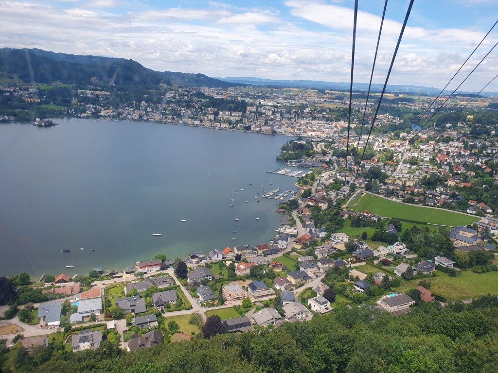 Wir lösten ein Kombiticket für die Gondelbahn und den Pfad, das zwar kein Geschenk ist, aber auf jeden Fall die Ausgabe wert ist. Die Gondel der Grünbergbahn schwebt in wenigen Minuten auf den Berg und bietet dabei schon eine traumhafte Aussicht auf den Traunsee mit der Stadt Gmunden und dem Seeschloss Orth.
