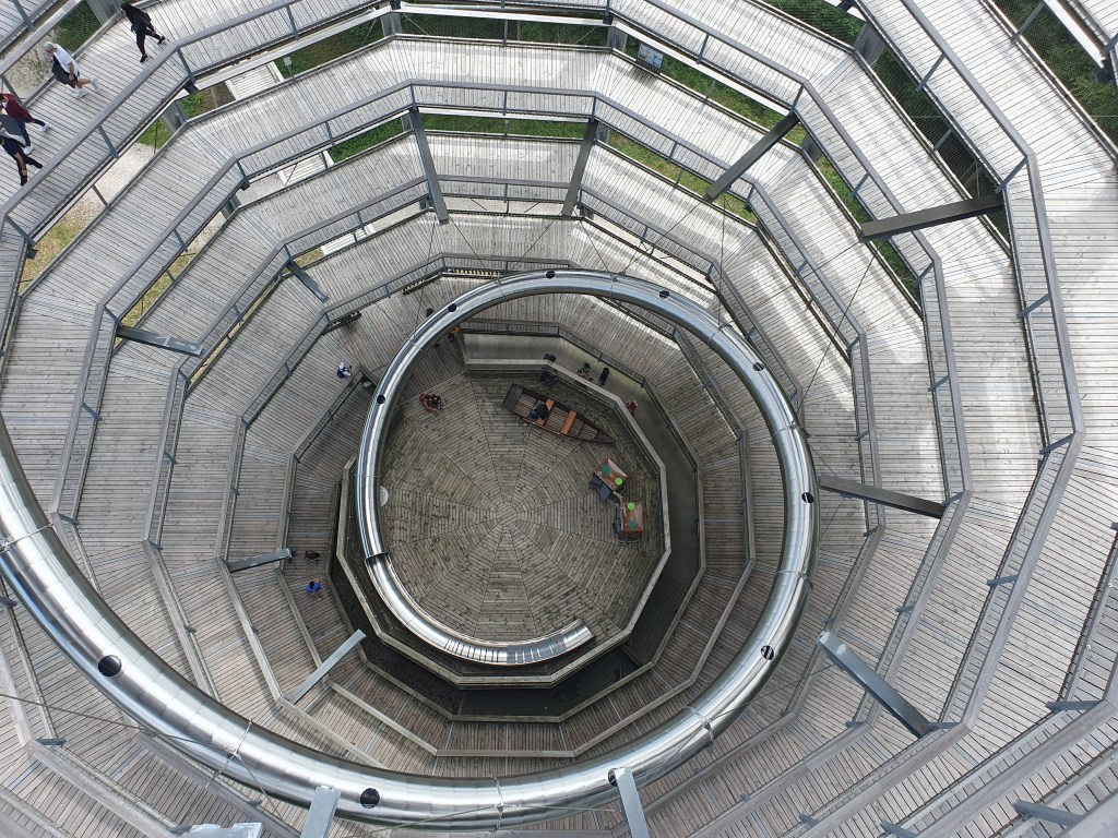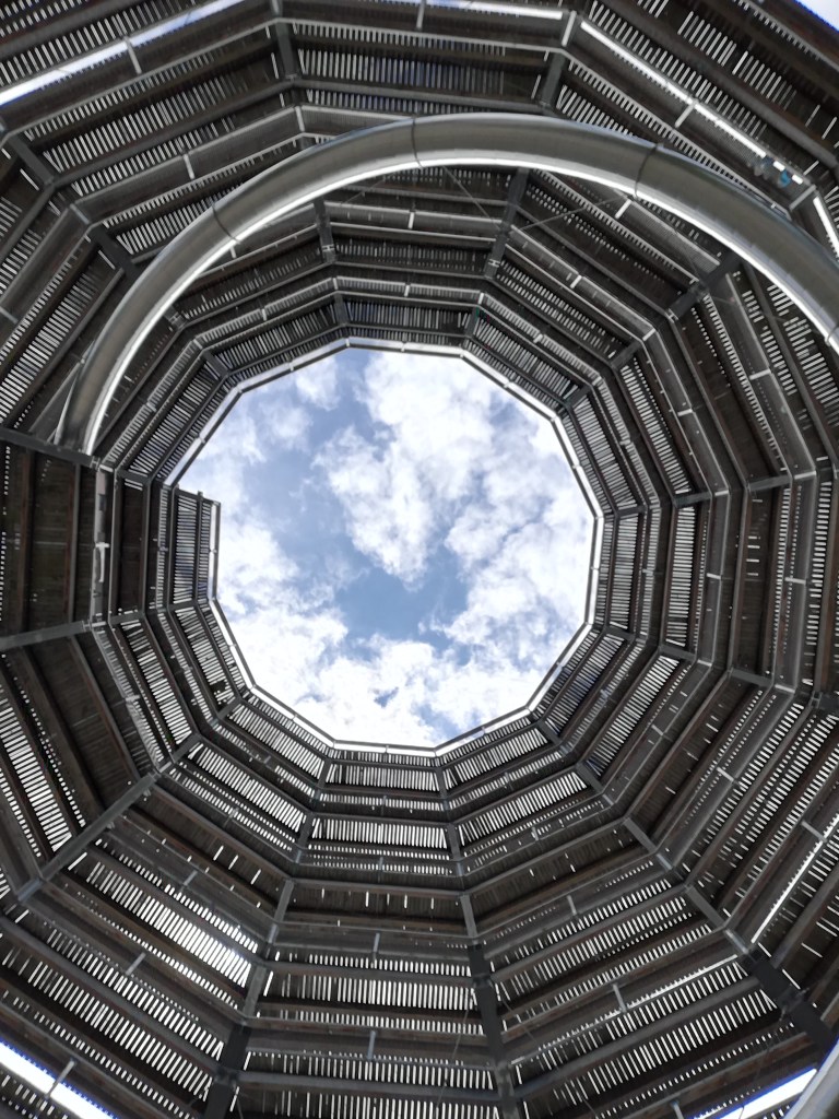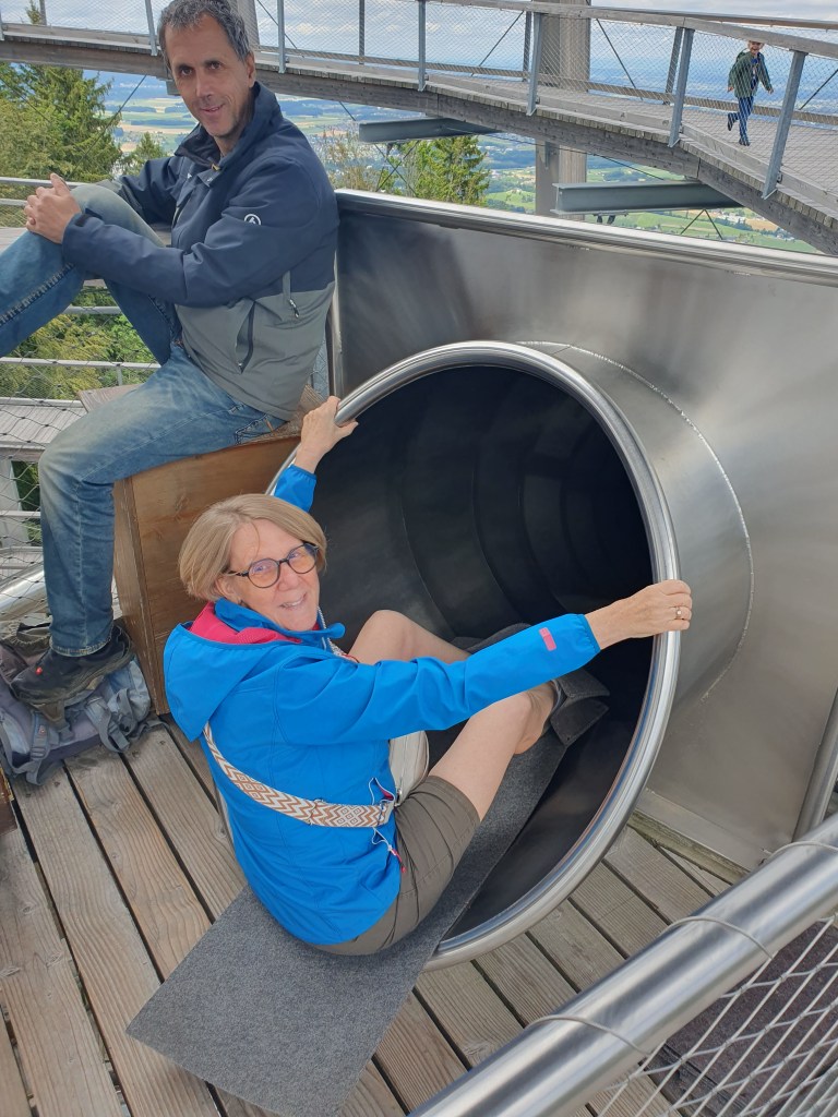 Gleich beim Einstieg in den Turm wurden wir darauf hingewiesen, selbst die Filzmatte für die Rutsche mitzunehmen. Diese schlängelt sich von einer Plattform in 28 Metern Höhe als Rohrrutsche über 75 Meter hinunter. Leider spielt da mein Hüftgelenk nicht mit, aber meine Frau hat sie natürlich getestet. Vorher bestiegen wir den Turm auf dem spiralartigen Weg bis ganz oben und wurden dafür mit einer Aussicht über halb Oberösterreich belohnt.