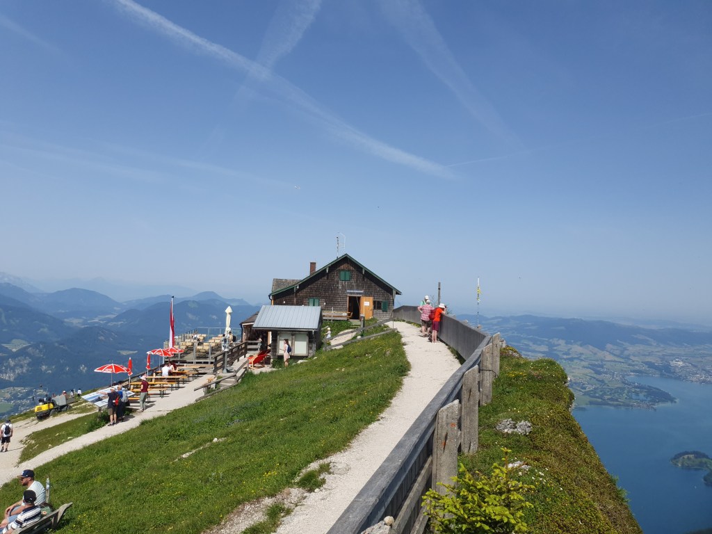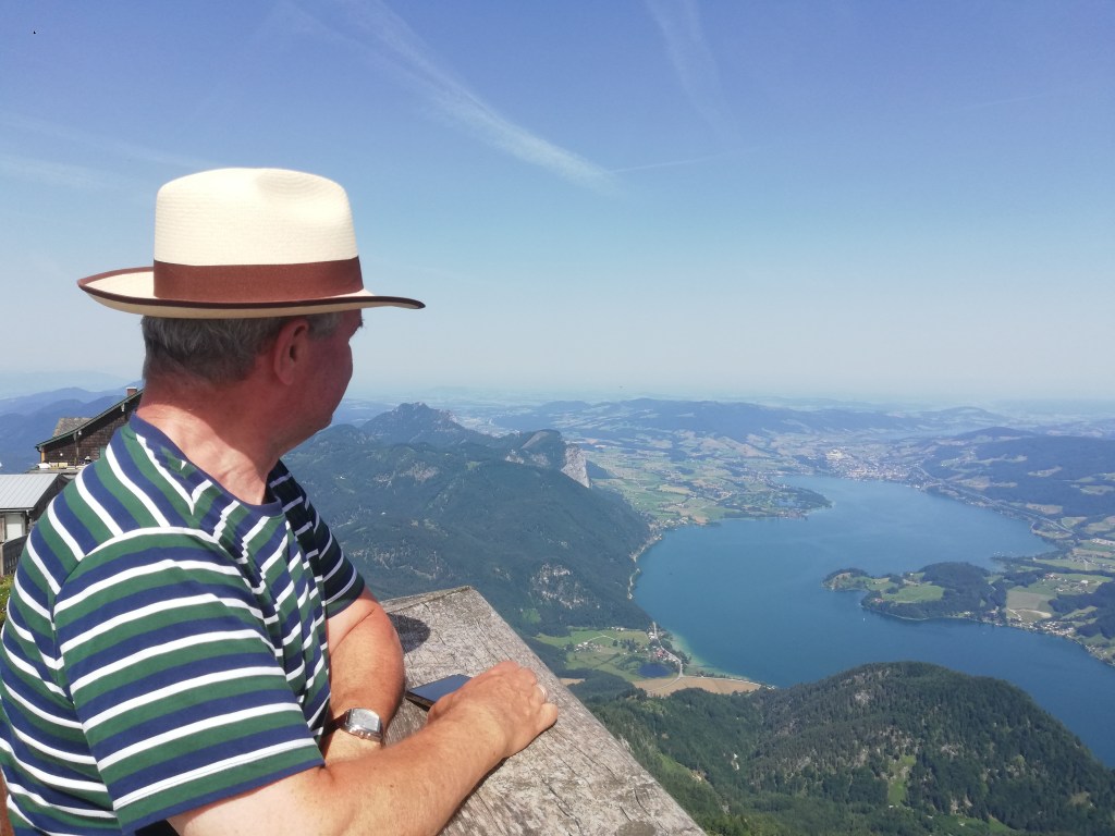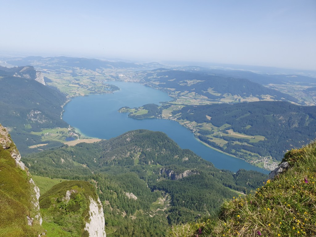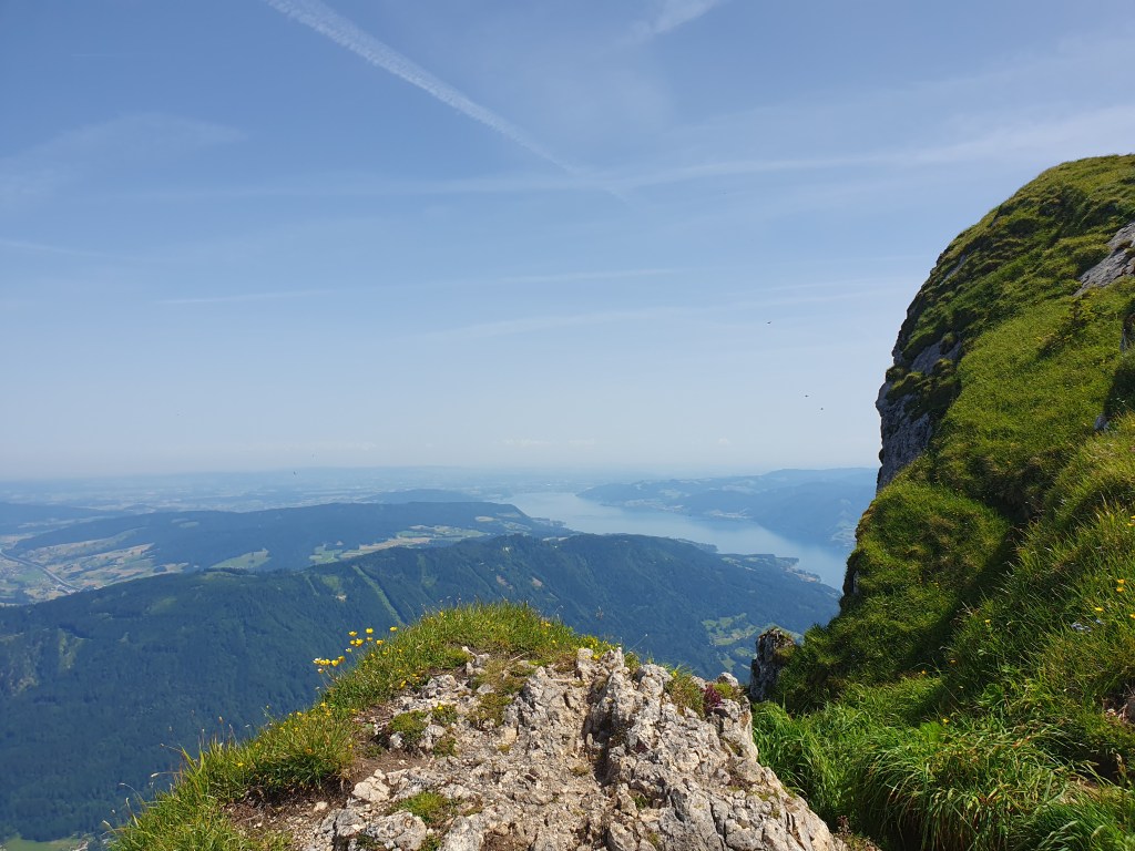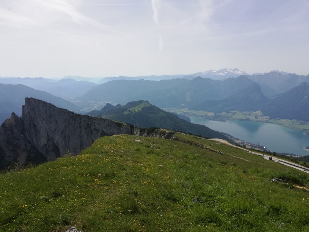 Wir hatten Glück mit dem Wetter und die Fernsicht war recht gut. Auf der einen Seite waren Wolfgangsee und ein Stück des Fuschlsees zu sehen, auf der anderen Seite der Attersee und Mondsee und dahinter der Irrsee. Vom nahen Zwölferhorn bis zum weit dahinter liegenden Watzmann, dem Tennengebirge bis zum dominaten Dachstein kann man auch als nicht besonders Bergkundiger eine imposante Alpenkulisse bewundern.