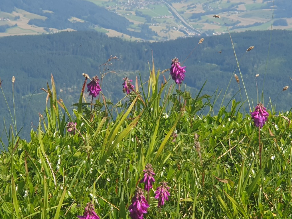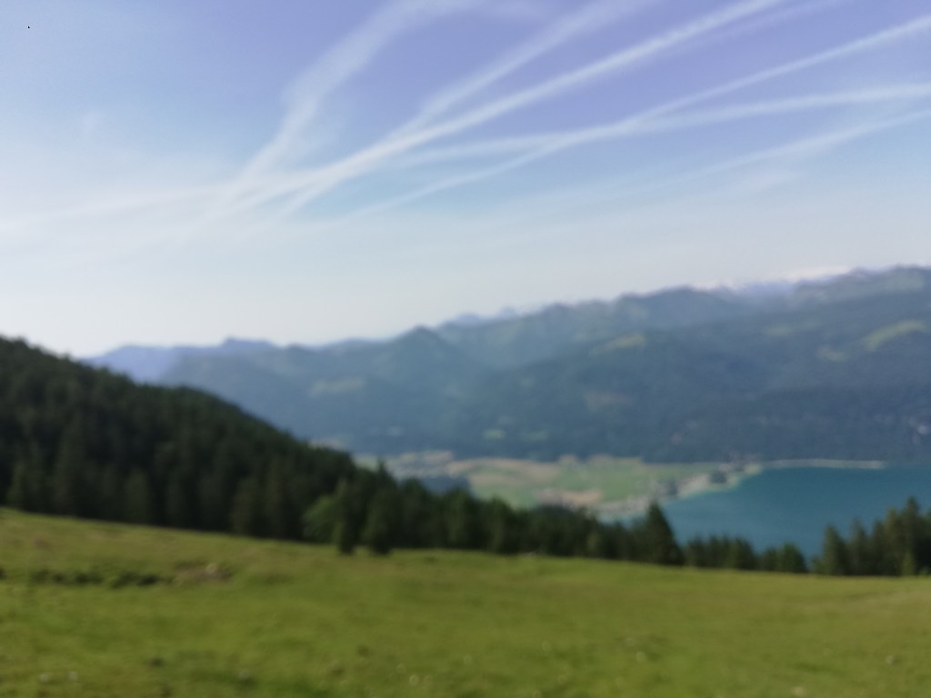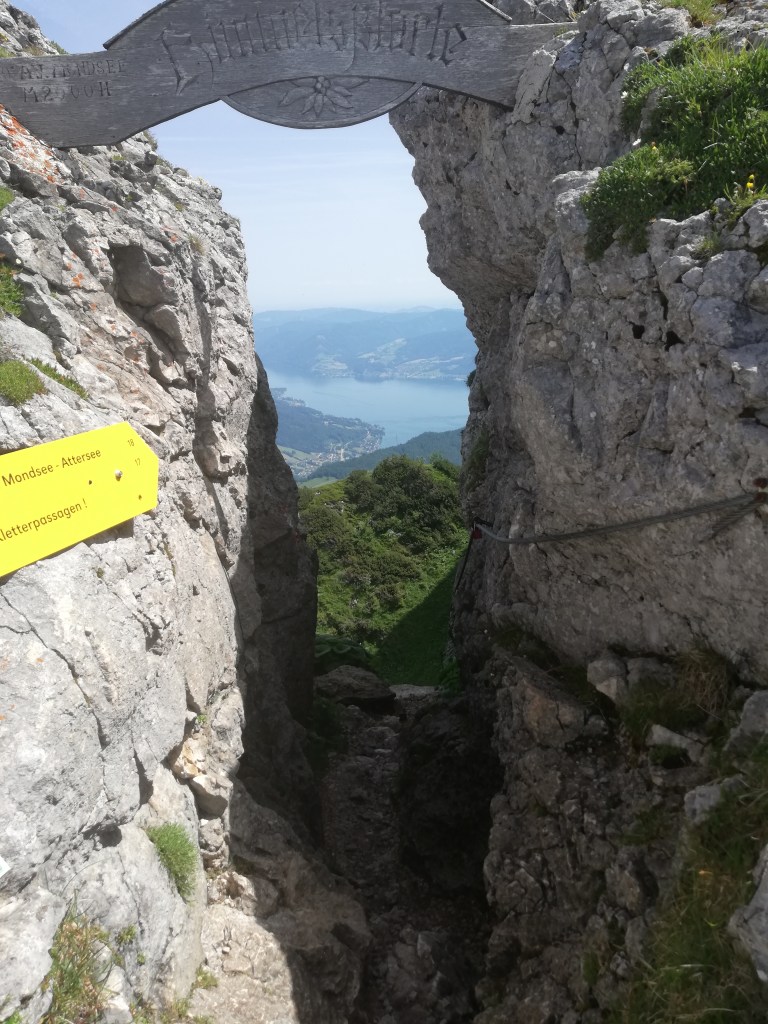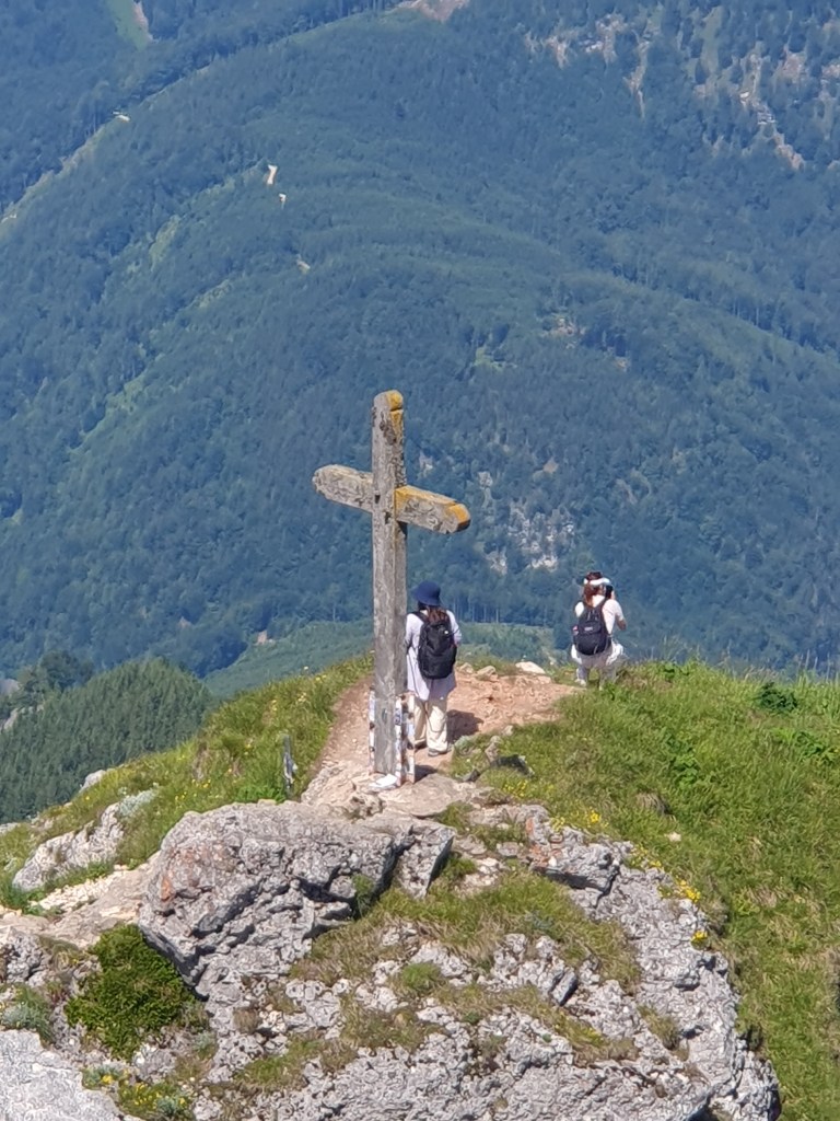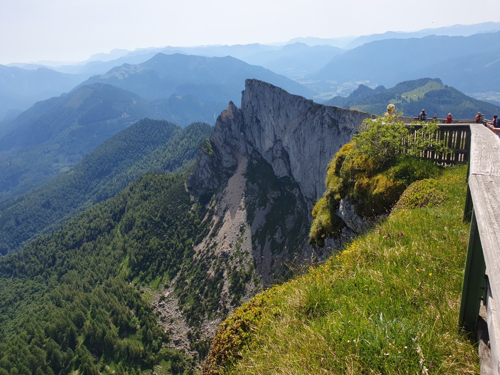 Wir hatten Glück mit dem Wetter und die Fernsicht war recht gut. Auf der einen Seite waren Wolfgangsee und ein Stück des Fuschlsees zu sehen, auf der anderen Seite der Attersee und Mondsee und dahinter der Irrsee. Vom nahen Zwölferhorn bis zum weit dahinter liegenden Watzmann, dem Tennengebirge bis zum dominaten Dachstein kann man auch als nicht besonders Bergkundiger eine imposante Alpenkulisse bewundern.