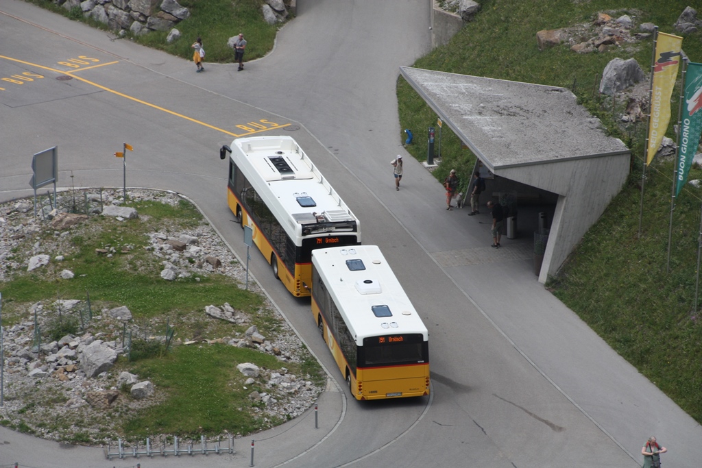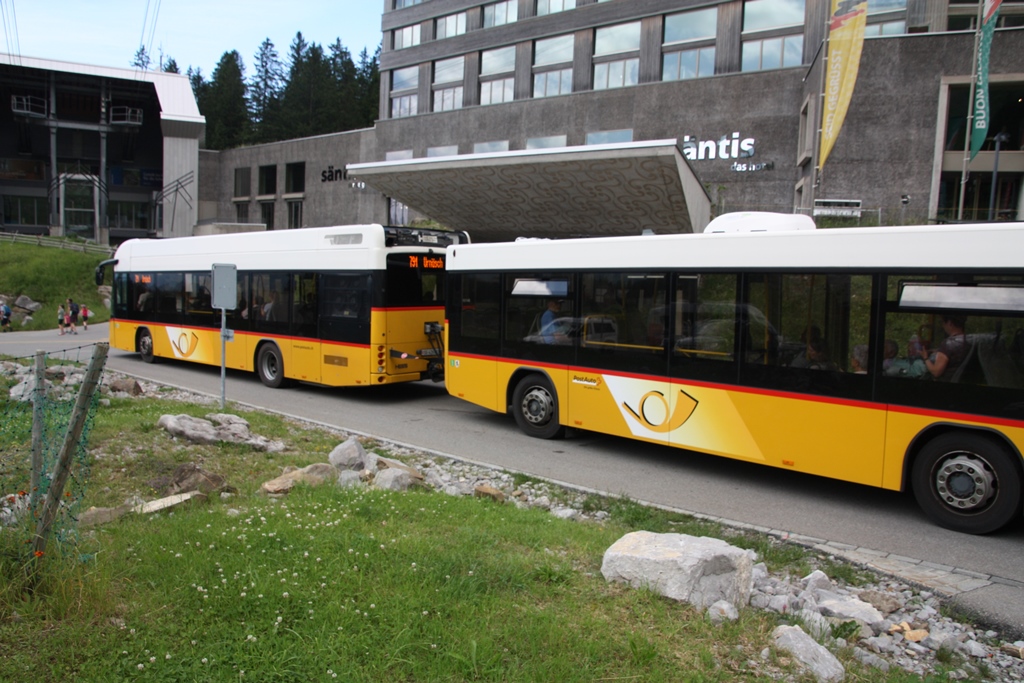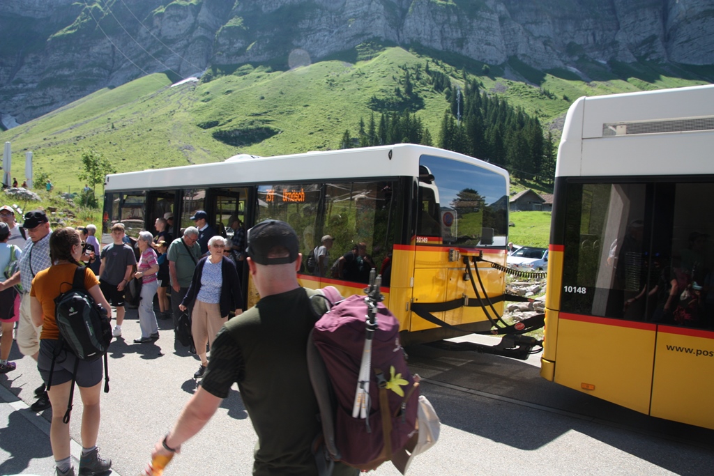Da es der letzte wirklich schöne Tag unserer Besuchswoche in der Schweiz zu werden scheint, entscheiden wir uns spontan und fahren mit dem Zug über Zürich HB bis Gossau SG, steigen in die Appenzeller Bahn bis Urnäsch und von dort, womit sonst in der Schweiz, mit dem Postauto, das sogar einen Personen-Anhänger hat, bis zur Talstation der Säntisbahn auf der Schwägalp.