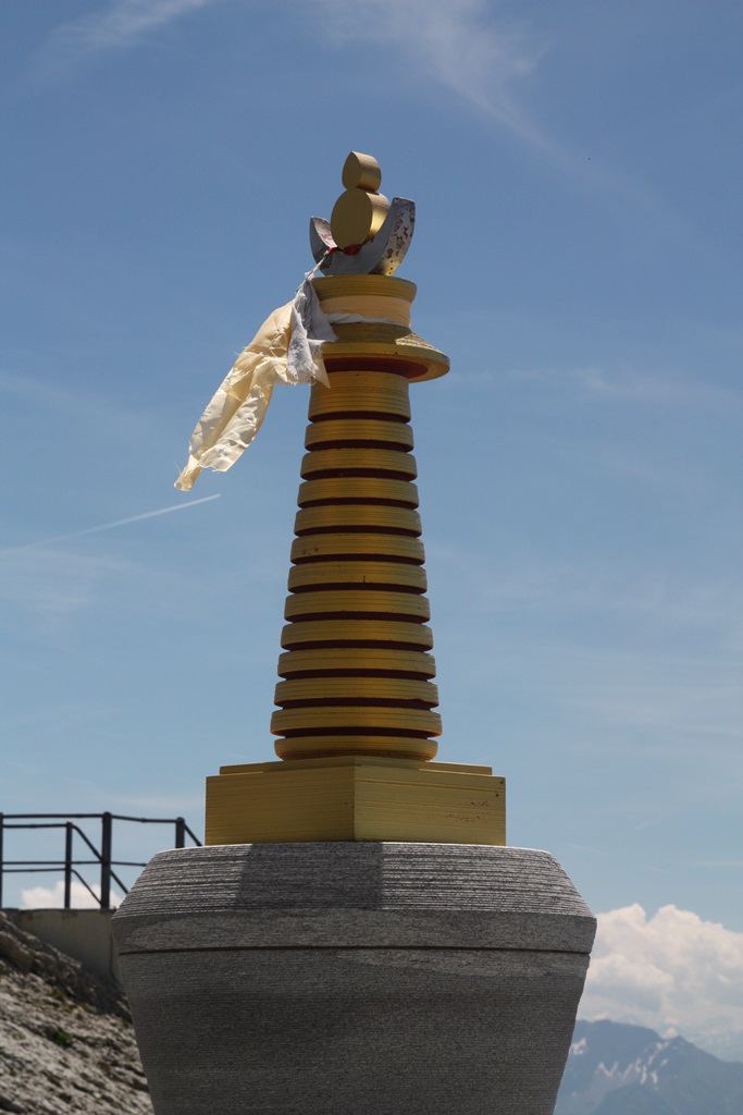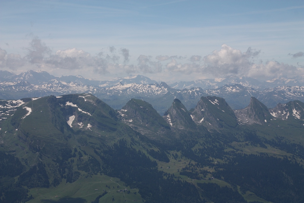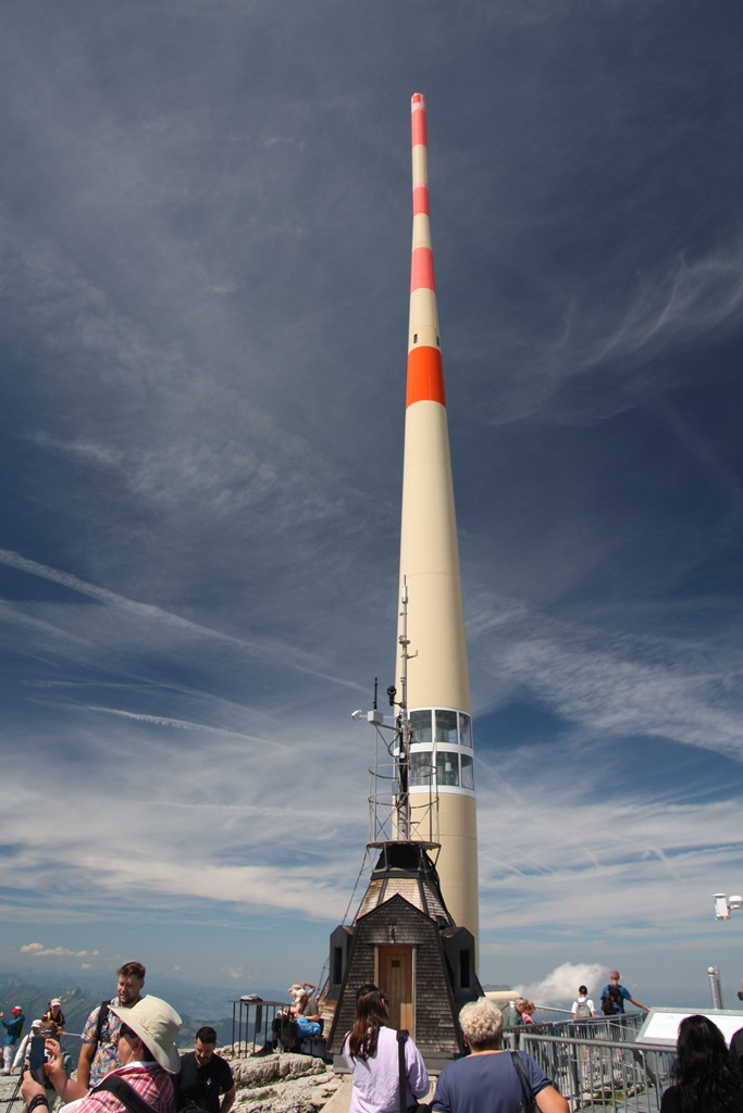 Wir gehen vom Postauto direkt zur Gondel, mit der man in nur 9 Minuten die Bergstation auf 2502 m erreicht. Das moderne Gebäude beherbergt einige Restaurants, Ausstellungen und sogar ein Hotel. Das alles wird überragt vom 123 m hohen Sendeturm der Swisscom. Wir steigen aber gleich die Stufen Richtung Gipfel hinauf und sind überwältigt von der Rundumsicht.